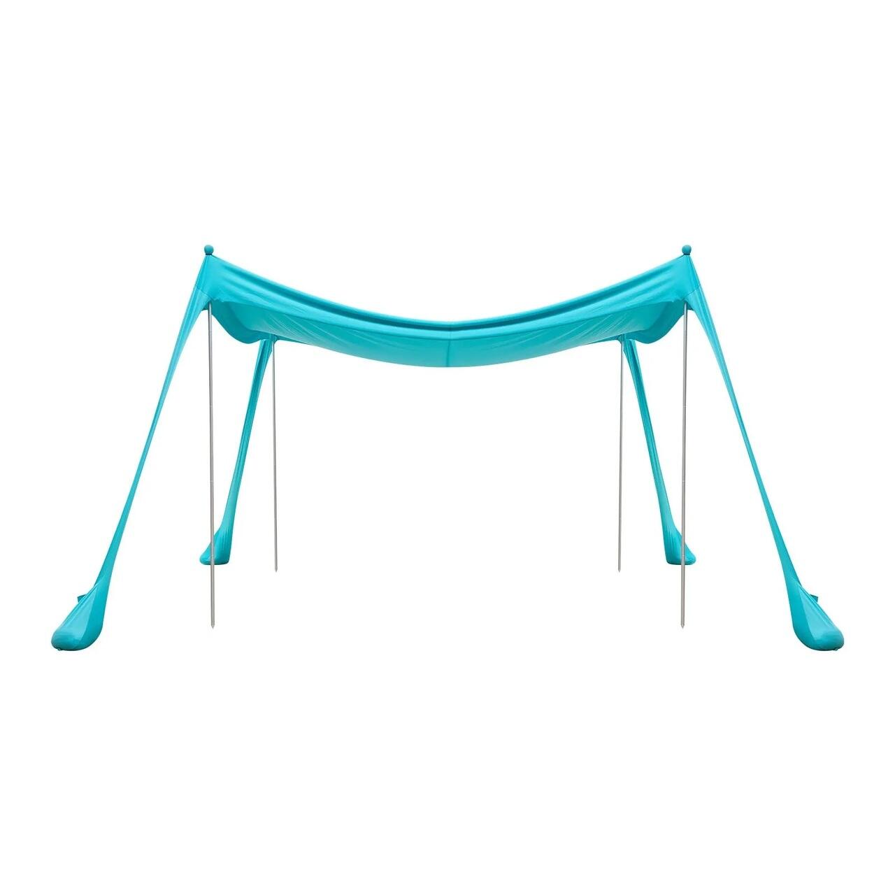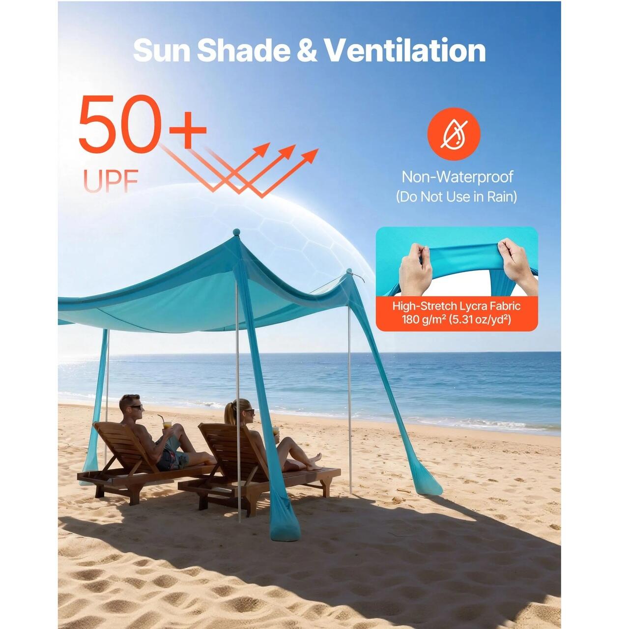 Protectie solara si racoare: Fabricata din material Lycra premium de 180 g/m² pentru protectie UPF 50+, copertina noastra de plaja blocheaza cea mai daunatoare lumina solara. Cu o respirabilitate, elasticitate si durabilitate excelente, va mentine racoros si confortabil in timpul zilelor lungi in aer liber.