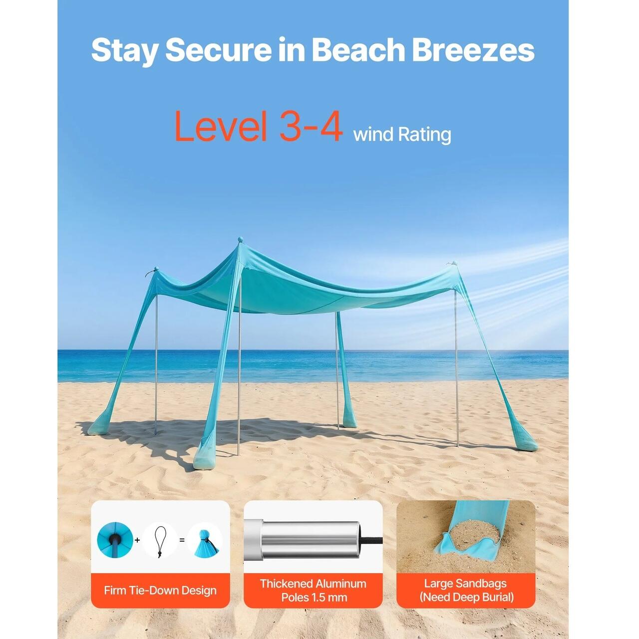 Nivel 3–4 Rezistenta la vant: Copertina noastra pentru plaja, rezistenta la brizele obisnuite de coasta, face fata fara a se rasturna. Dispune de 4 saci mari de nisip, 4 stalpi de sustinere din aluminiu ingrosat si snururi elastice superioare sigure care leaga strans stalpii pentru o rezistenta si stabilitate sporite.