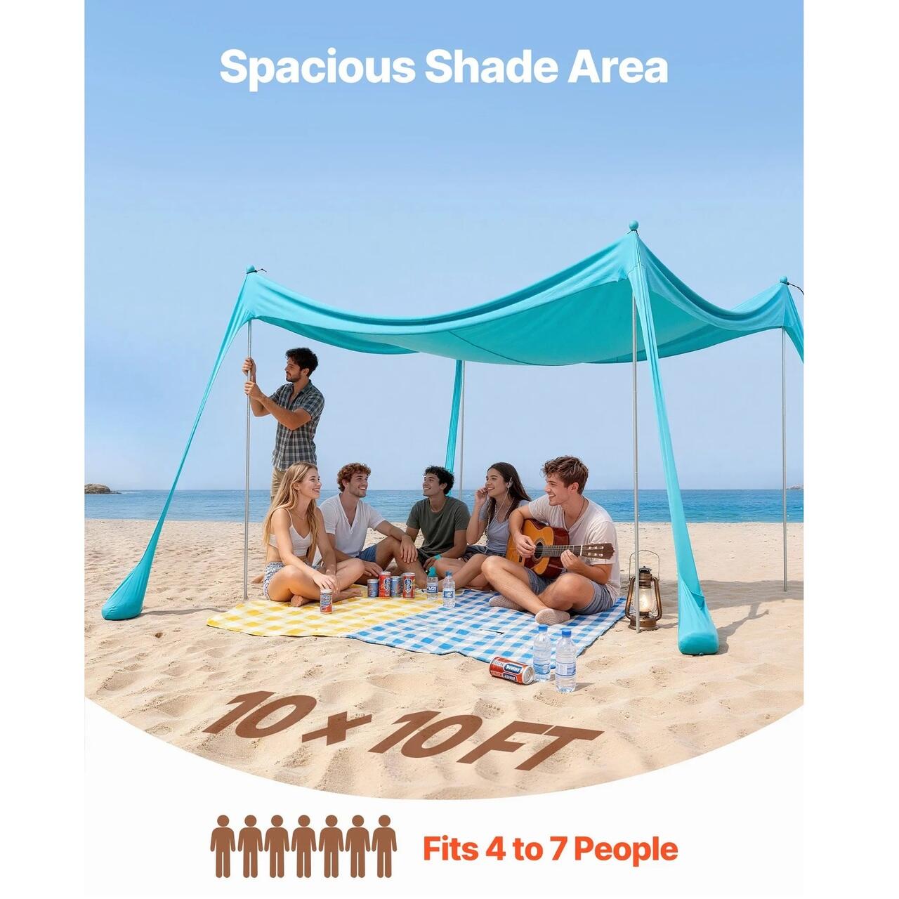 Acoperire spatioasa pentru umbra: Acest adapost solar tip cort de plaja ofera o zona umbrita mare de 3 x 3 metri, ideala pentru familii sau grupuri de 4-7 persoane. Sacii de nisip ancorati gravitational si lopata de nisip inclusa fac instalarea rapida si usoara chiar pe plaja.