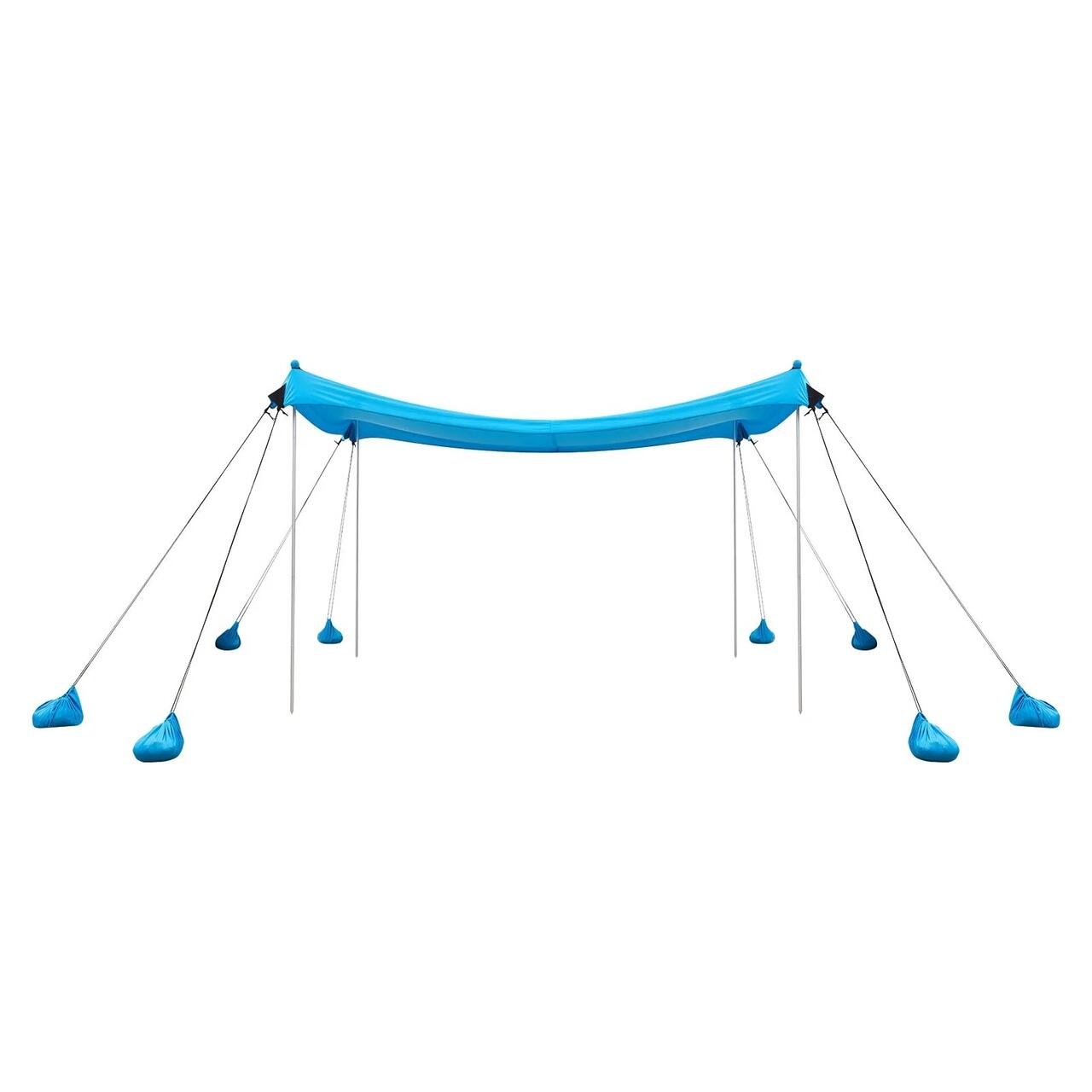 Construit pentru toate tipurile de teren: Cu optiuni de ancorare atat cu saci de nisip, cat si cu tarusi, acest baldachin de umbrire pentru plaja se instaleaza in siguranta pe nisip, iarba si multe altele. Repozitionati cu usurinta sacii de nisip sau stalpii pentru a regla unghiul de umbrire in functie de miscarea soarelui.