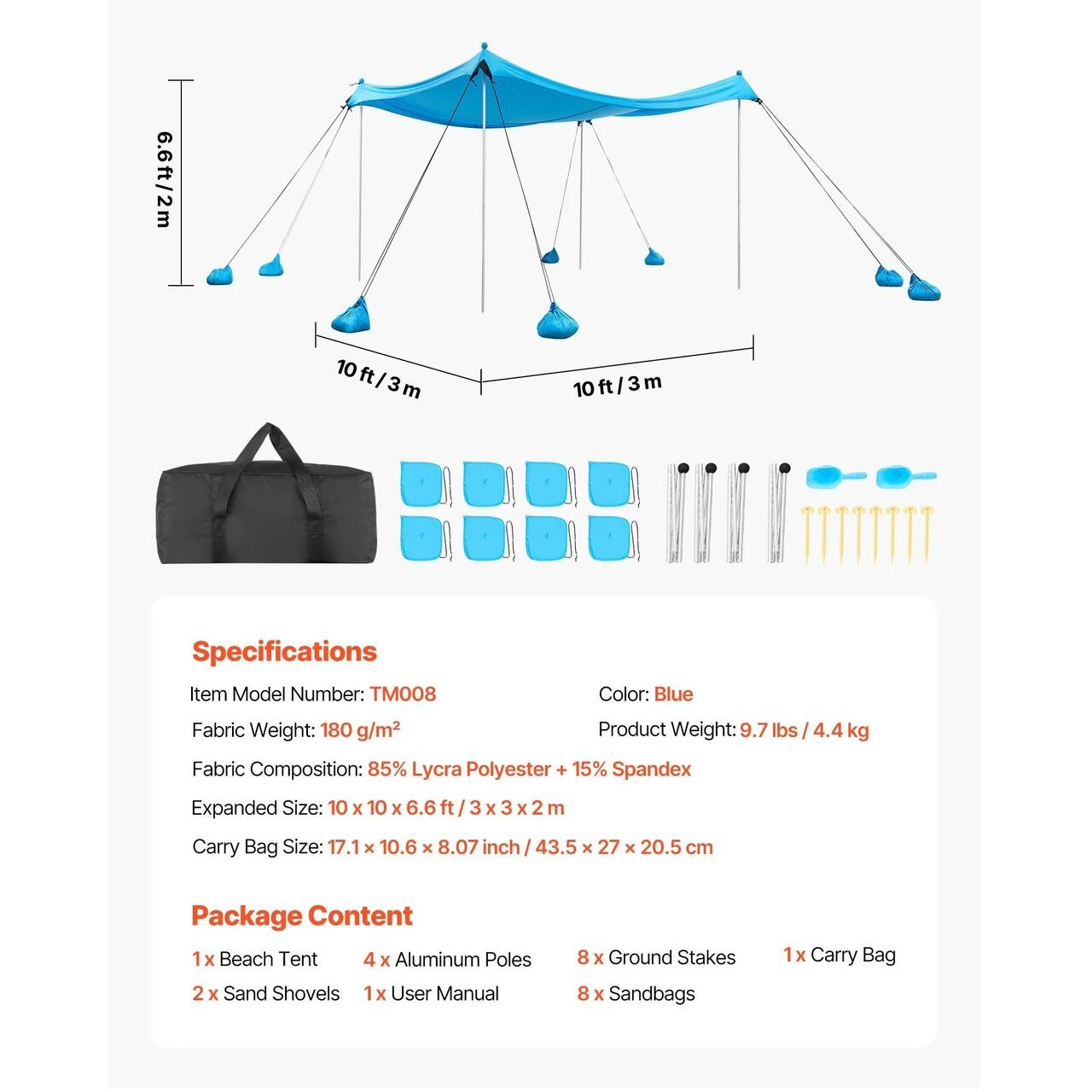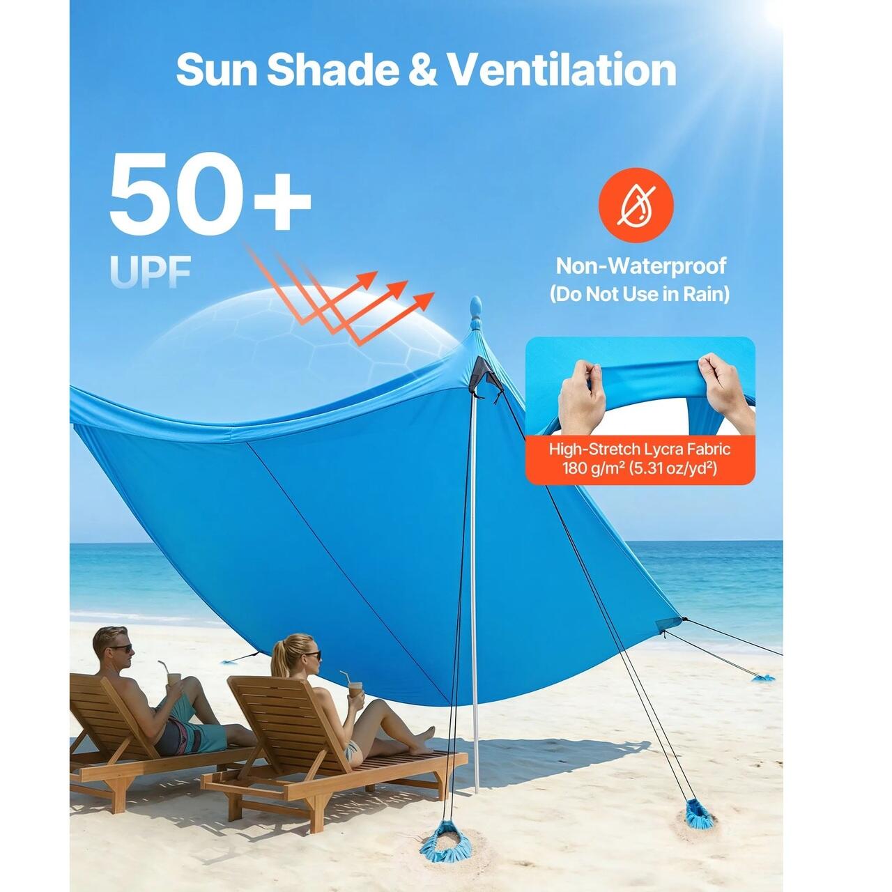 Protectie solara si racoare: Fabricata din material Lycra premium de 180 g/m² pentru protectie UPF 50+, copertina noastra de plaja blocheaza cea mai daunatoare lumina solara. Cu o respirabilitate, elasticitate si durabilitate excelente, va mentine racoros si confortabil in timpul zilelor lungi in aer liber.