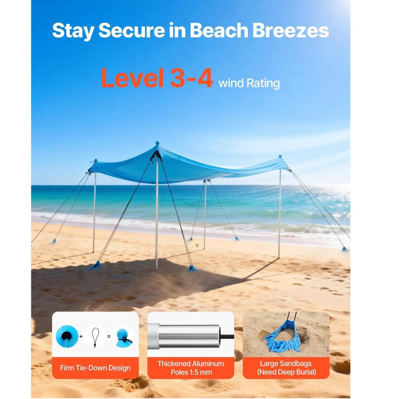 Nivel 3–4 Rezistenta la vant: Copertina noastra pentru plaja, rezistenta la brizele obisnuite de coasta, face fata fara a se rasturna. Dispune de 8 saci mari de nisip, 4 stalpi de sustinere din aluminiu ingrosat si snururi elastice superioare sigure care leaga strans stalpii pentru rezistenta si stabilitate sporite.