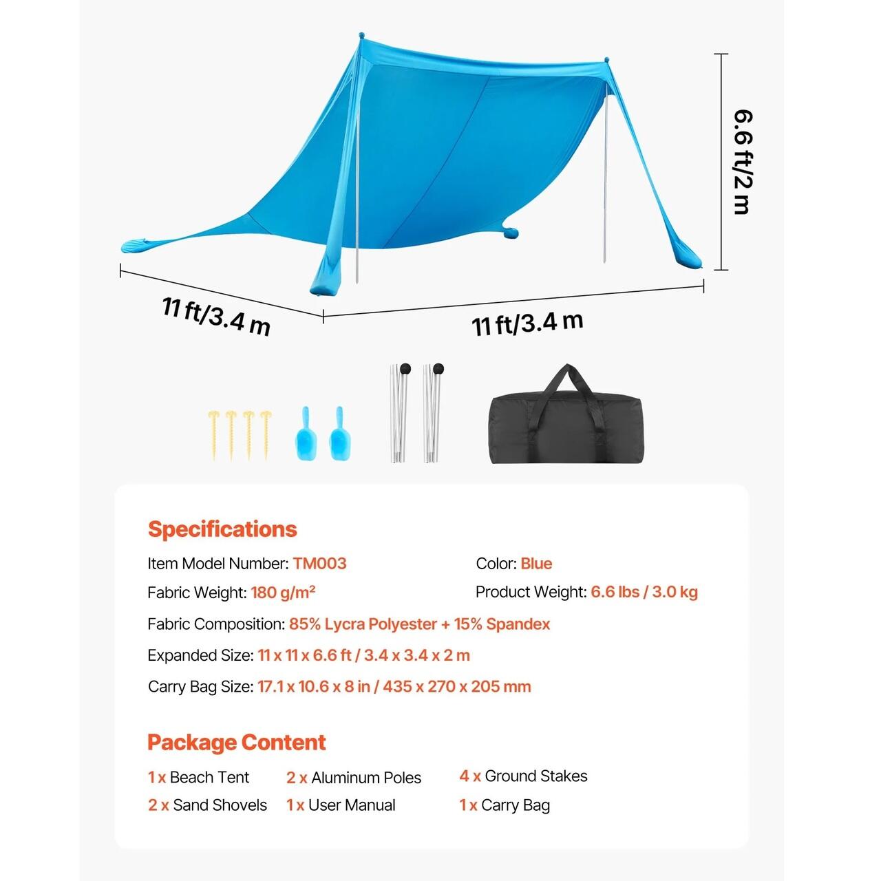 Acoperire spațioasă pentru umbră: Acest adăpost solar tip cort de plajă oferă o zonă umbrită mare de 3,3 x 3,3 metri, ideală pentru familii sau grupuri de 6-8 persoane. Sacii de nisip ancorați gravitațional și lopata de nisip inclusă fac instalarea rapidă și ușoară chiar pe plajă.
