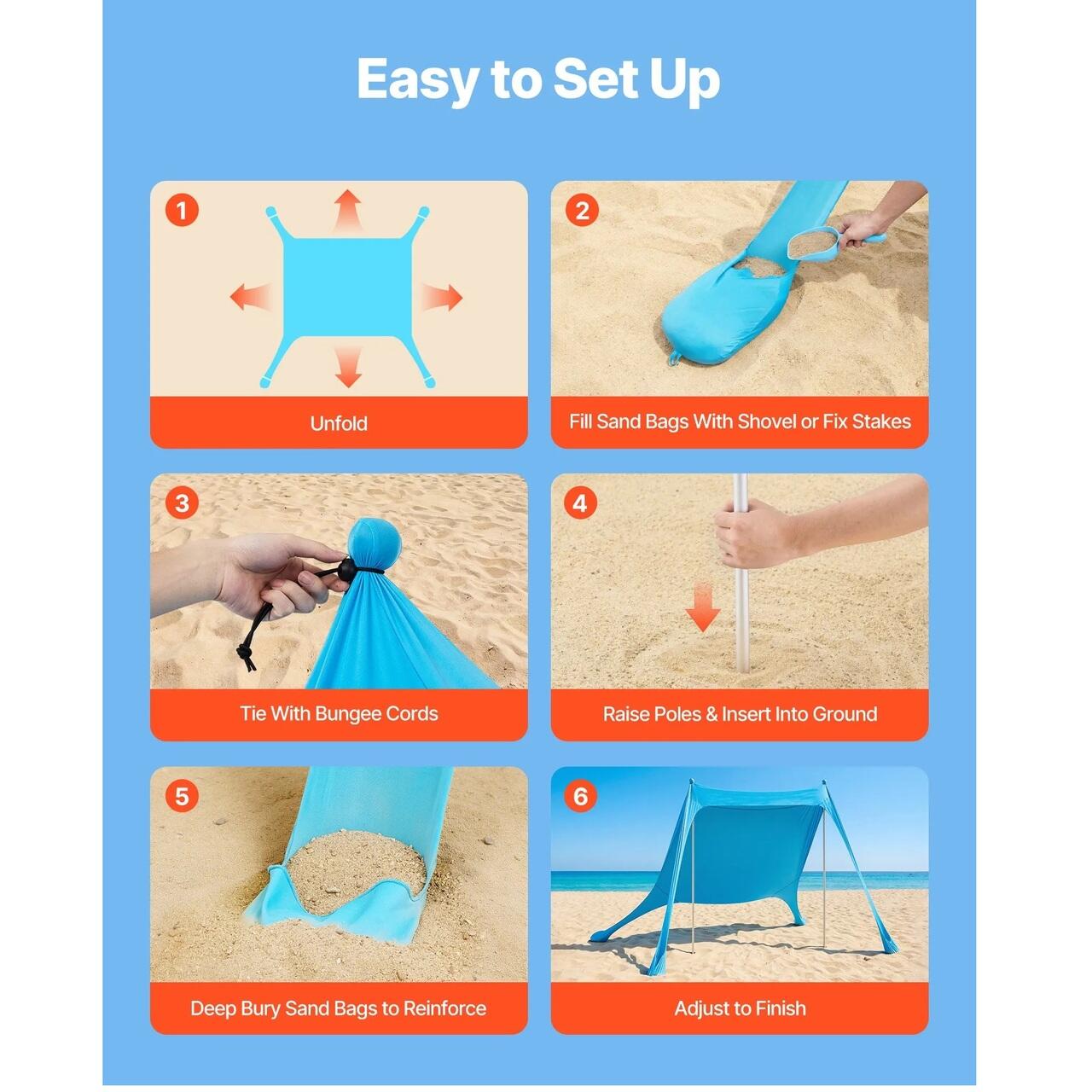Construit pentru toate tipurile de teren: Cu opțiuni de ancorare atât cu saci de nisip, cât și cu țăruși, acest baldachin de umbrire pentru plajă se instalează în siguranță pe nisip, iarbă și multe altele. Repoziționați cu ușurință sacii de nisip sau stâlpii pentru a regla unghiul de umbrire în funcție de mișcarea soarelui.
