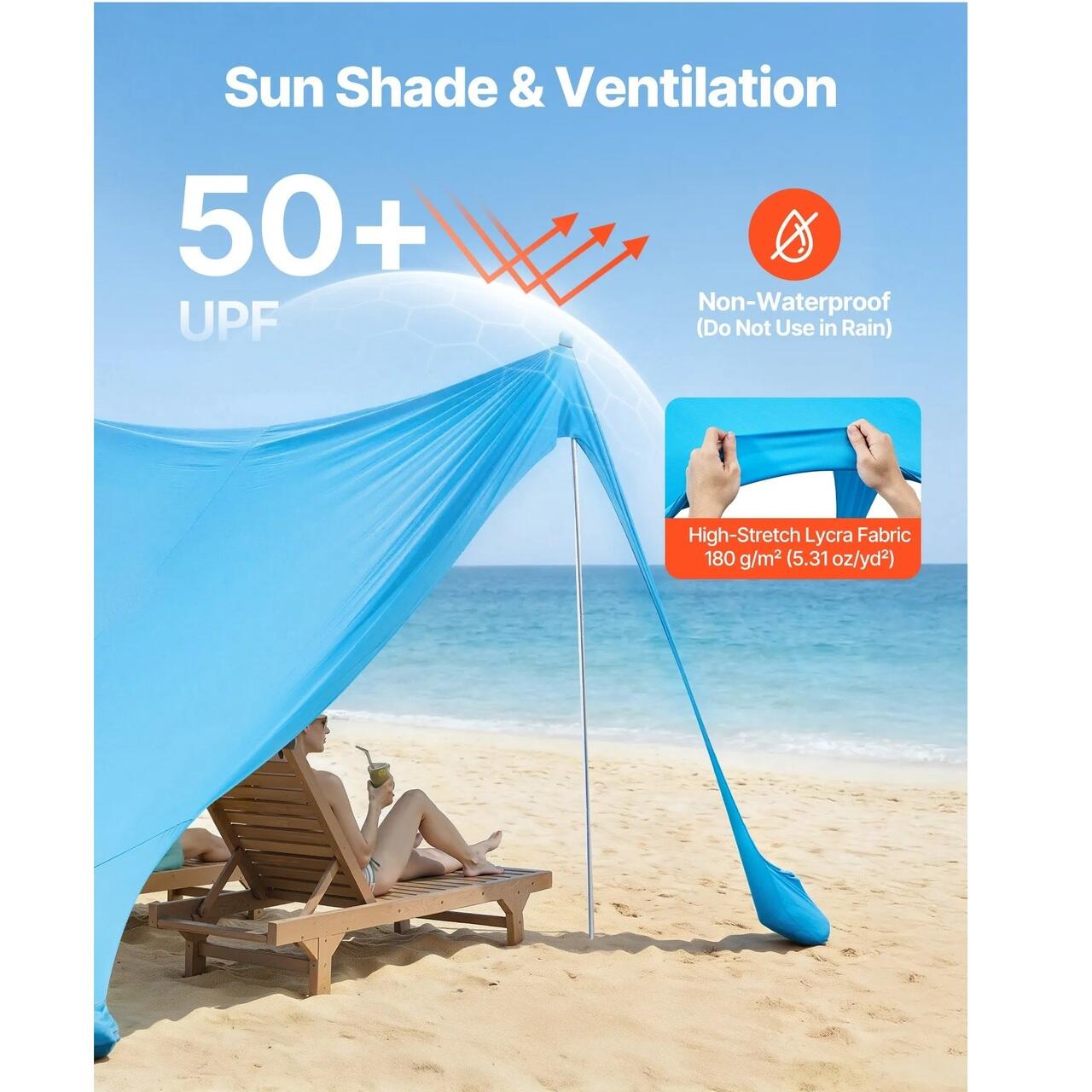 Protecție solară și răcoare: Fabricată din material Lycra premium de 180 g/m² pentru protecție UPF 50+, copertina noastră de plajă blochează cea mai dăunătoare lumină solară. Cu o respirabilitate, elasticitate și durabilitate excelente, vă menține răcoros și confortabil în timpul zilelor lungi în aer liber.