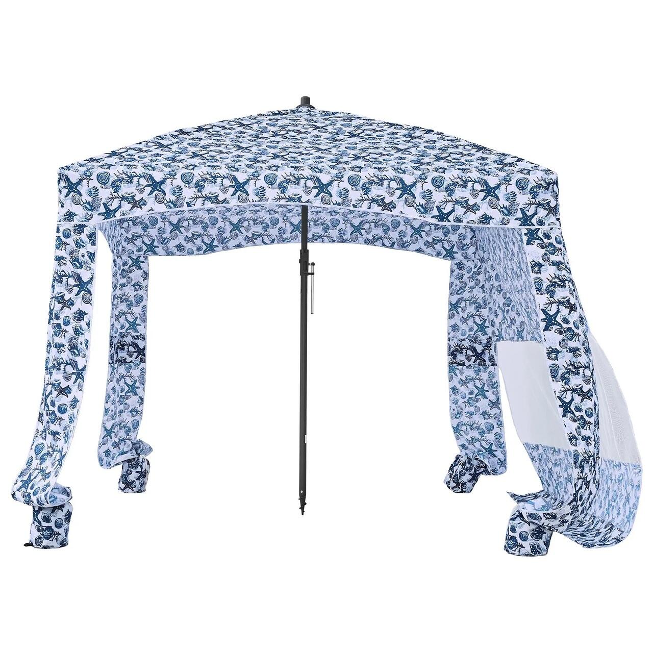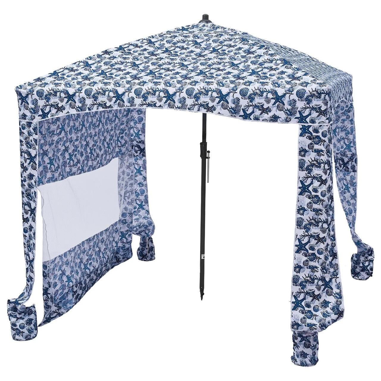 Pavilion gradina/plaja, Portabil 183x183 cm, 1 x perete lateral, Alb/Albastru, Protecție solara UPF 50+, Geanta, Cadru fibra de sticla