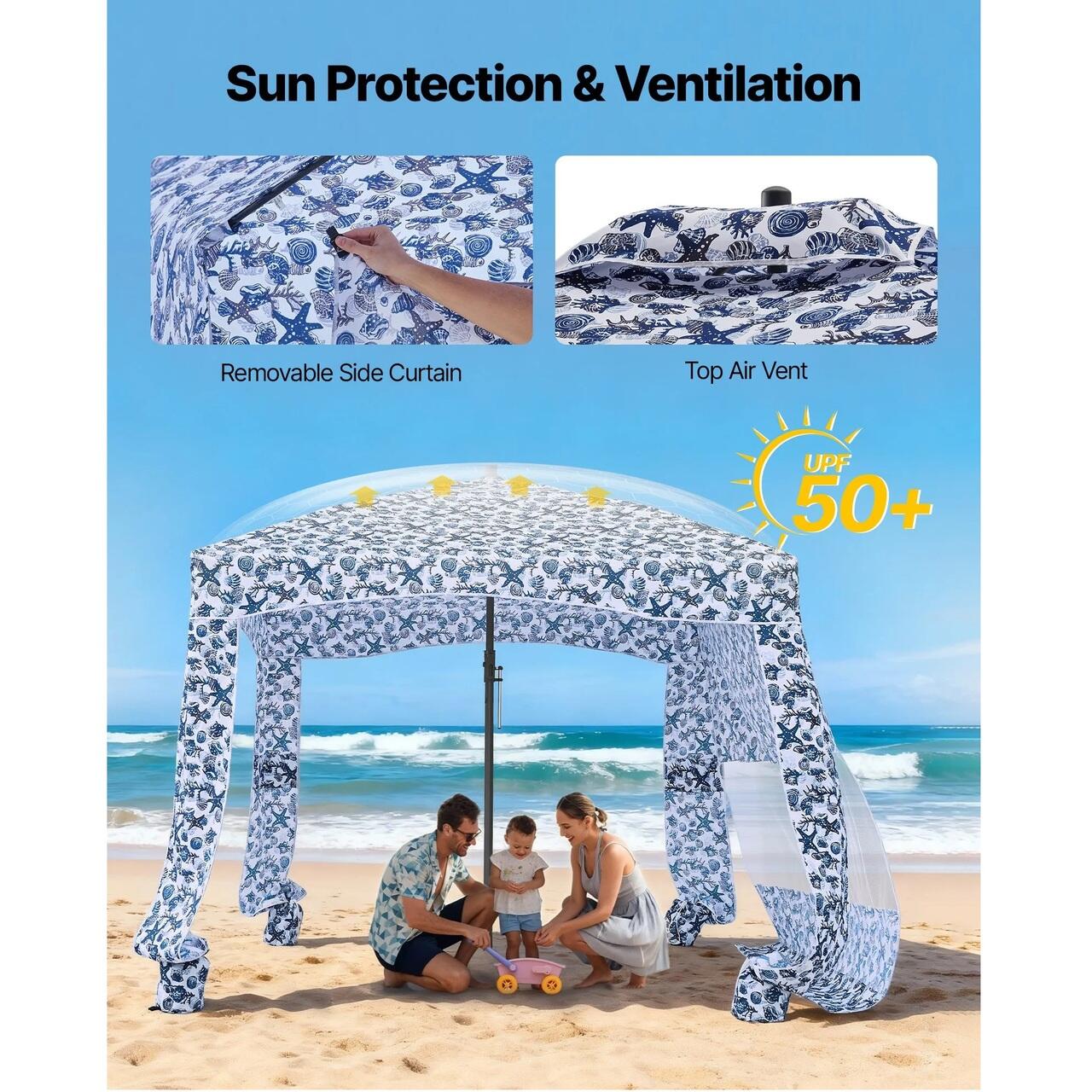 Protectie solara UPF 50+: Fabricat din material rezistent la soare de 140 g/m², cortul nostru de plaja tip cabana ofera umbra si reduce riscul de arsuri solare. Cortina laterala este prevazuta cu plasa respirabila, care favorizeaza circulatia aerului si disipeaza caldura pentru a crea un mediu mai racoros.