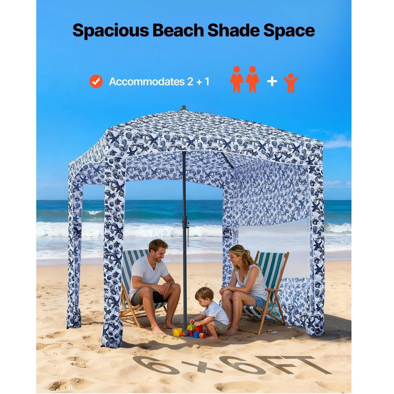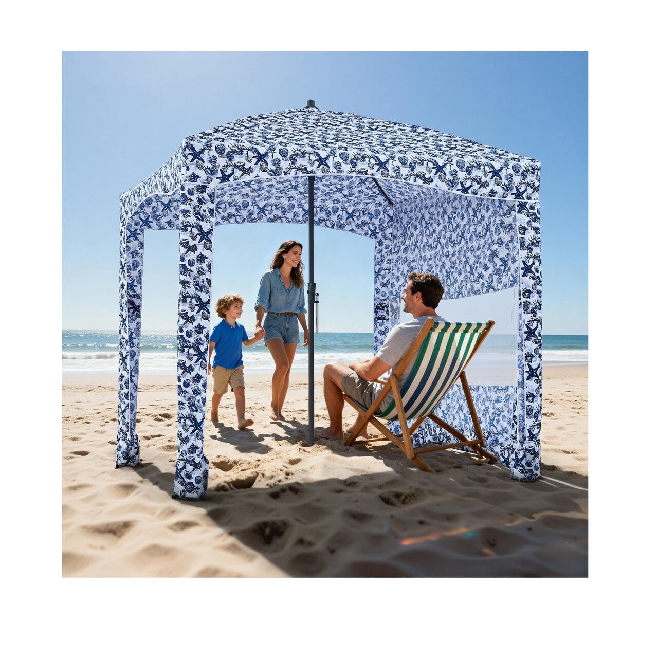Cabana de plaja de 1,8 x 1,8 m: Aceasta cabana de plaja spatioasa, cu perdea laterala, poate gazdui confortabil doua persoane, scaune si echipament. Proiectata cu buzunare de depozitare, aceasta pastreaza telefoanele, ochelarii de soare si crema de protectie solara la indemana.