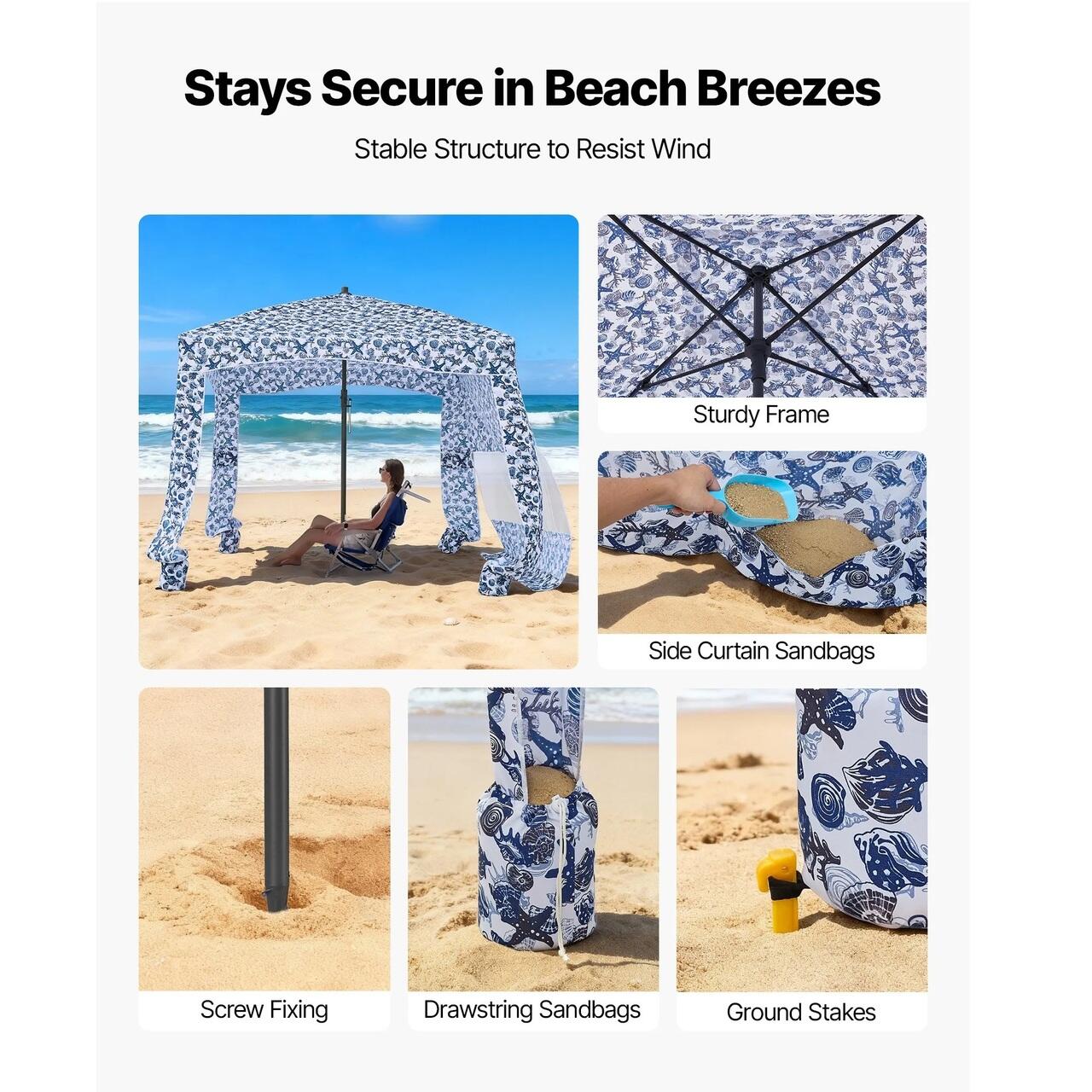 Rezistenta la vant: Echipata cu un cadru robust din fibra de sticla, un stalp principal cu suruburi, saci de nisip si tarusi de pamant, aceasta cabana mare de plaja ramane ferm ancorata in nisip. Rezista la prabusire sau la vant, chiar si sub briza usoara a marii.