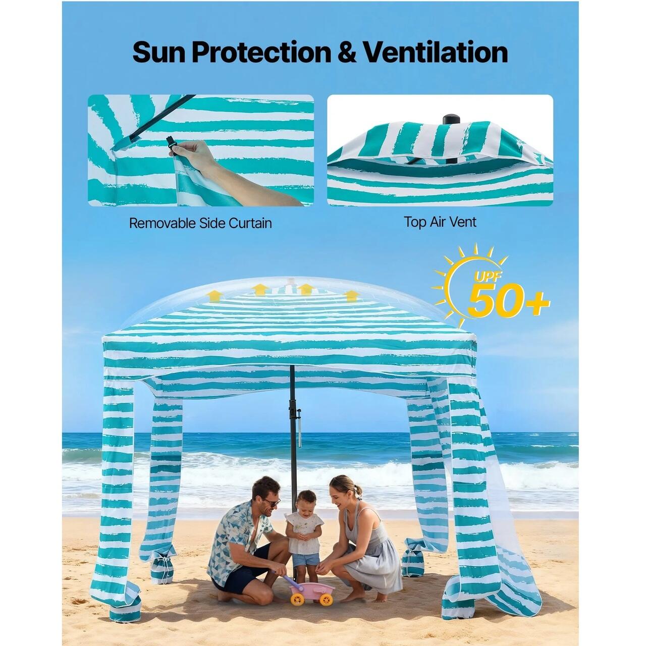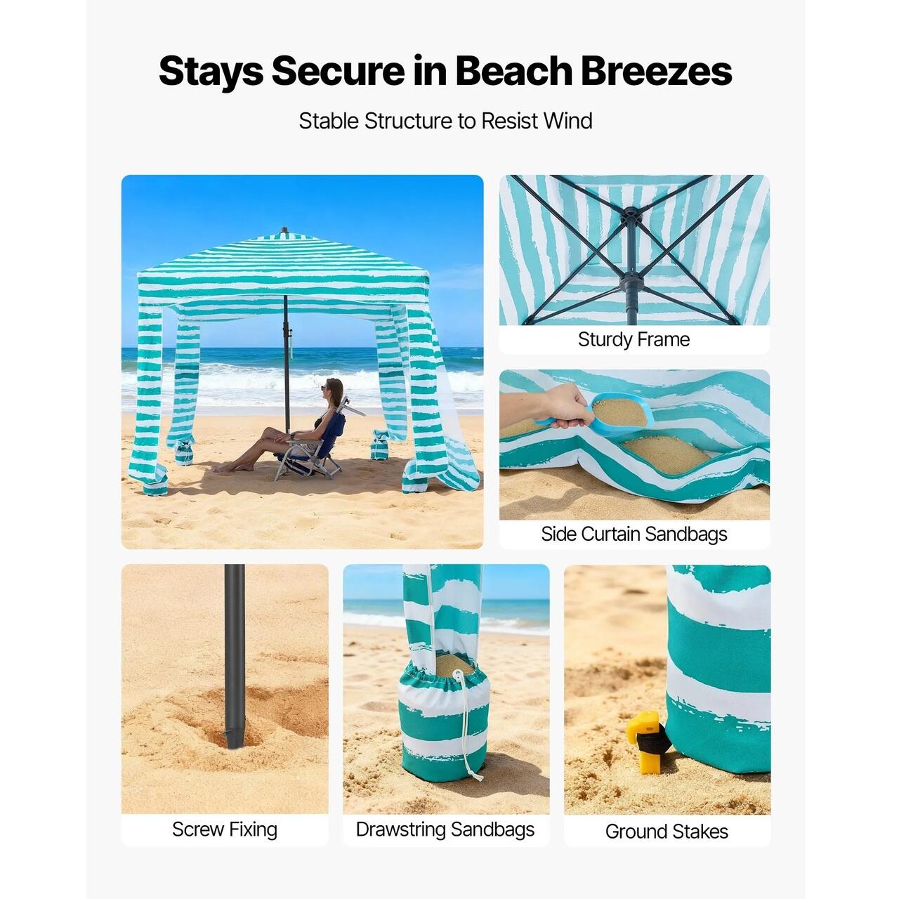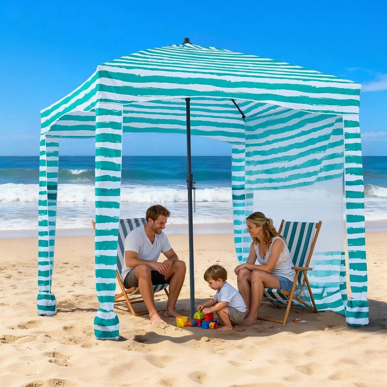 Cabana de plaja de 1,8 x 1,8 m: Aceasta cabana de plaja spatioasa, cu perdea laterala, poate gazdui confortabil doua persoane, scaune si echipament. Proiectata cu buzunare de depozitare, aceasta pastreaza telefoanele, ochelarii de soare si crema de protectie solara la indemana.
