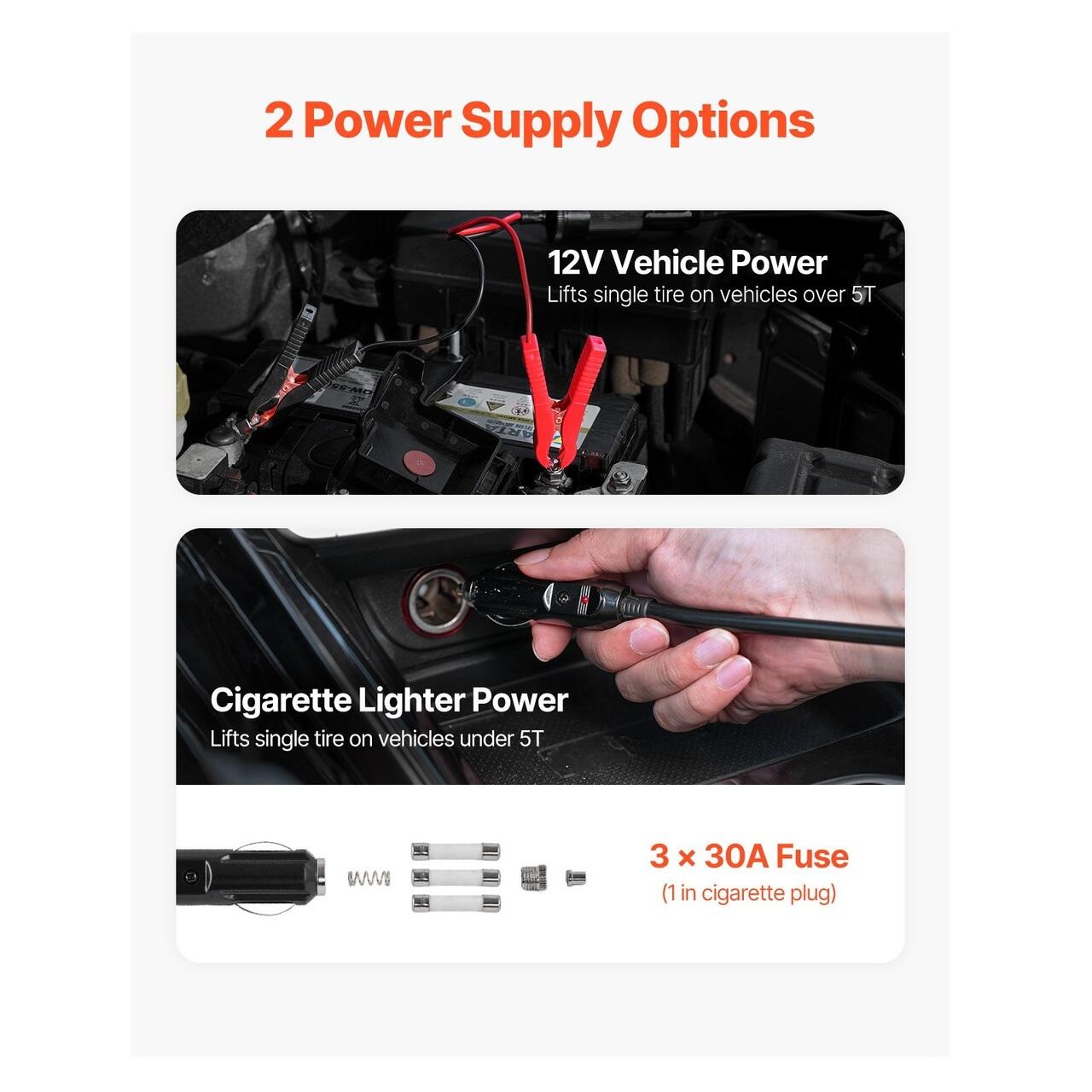 Sursa de alimentare duala: Echipat cu o bricheta si o clema de alimentare de 12 V pentru masina pentru optiuni flexibile de alimentare. Pentru vehiculele de peste 5T, recomandam utilizarea sursei de alimentare a masinii pentru a asigura o ridicare stabila. 2 sigurante de rezerva incluse pentru a evita arderea sigurantei.