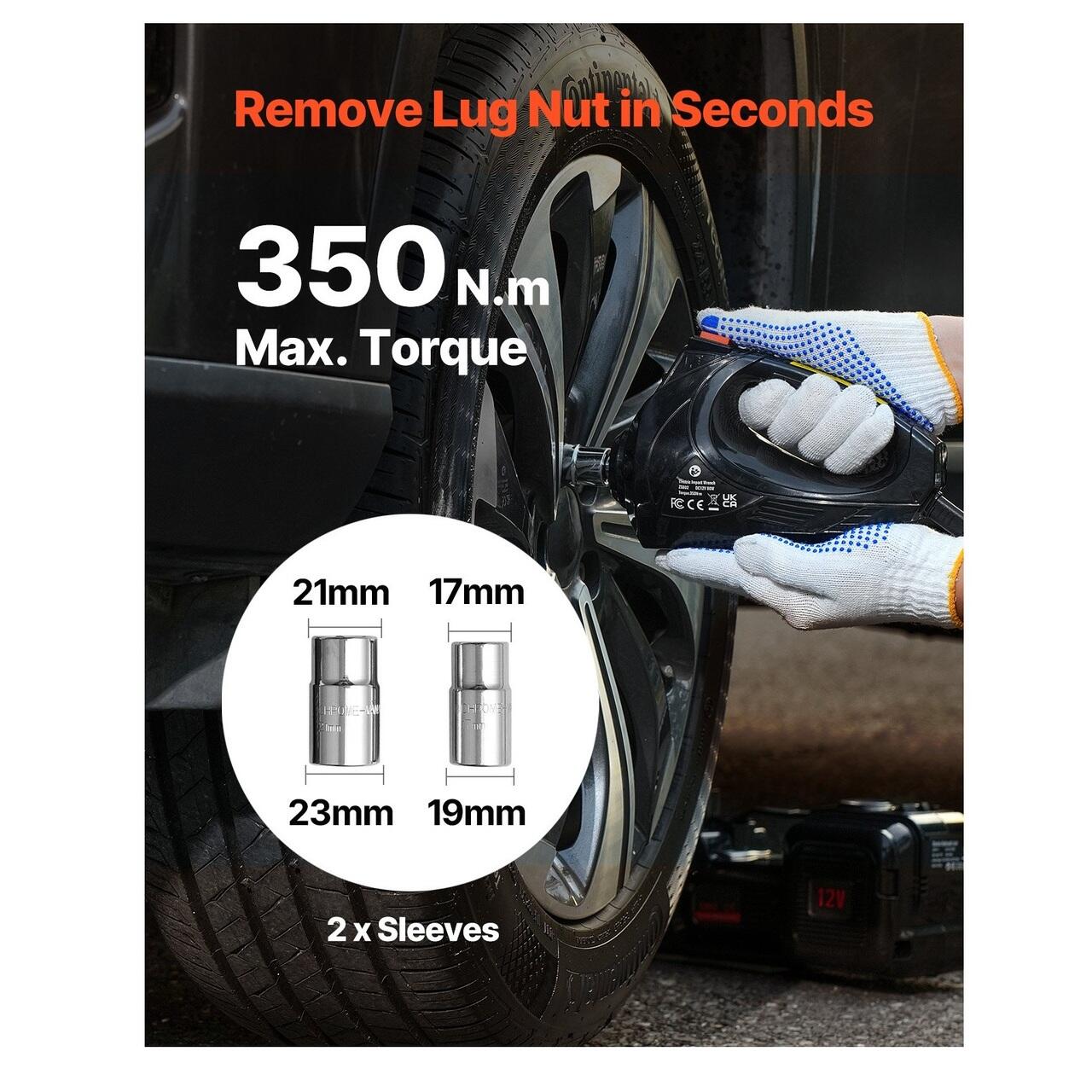 Cheie electrica eficienta: Cu un cuplu maxim de 350 Nm, aceasta cheie electrica strange sau slabeste suruburile in cateva secunde. Include 2 prize hexagonale, compatibile cu 4 dimensiuni de suruburi (17/19 mm si 21/23 mm), care se potrivesc cu majoritatea piulitelor pentru roti.