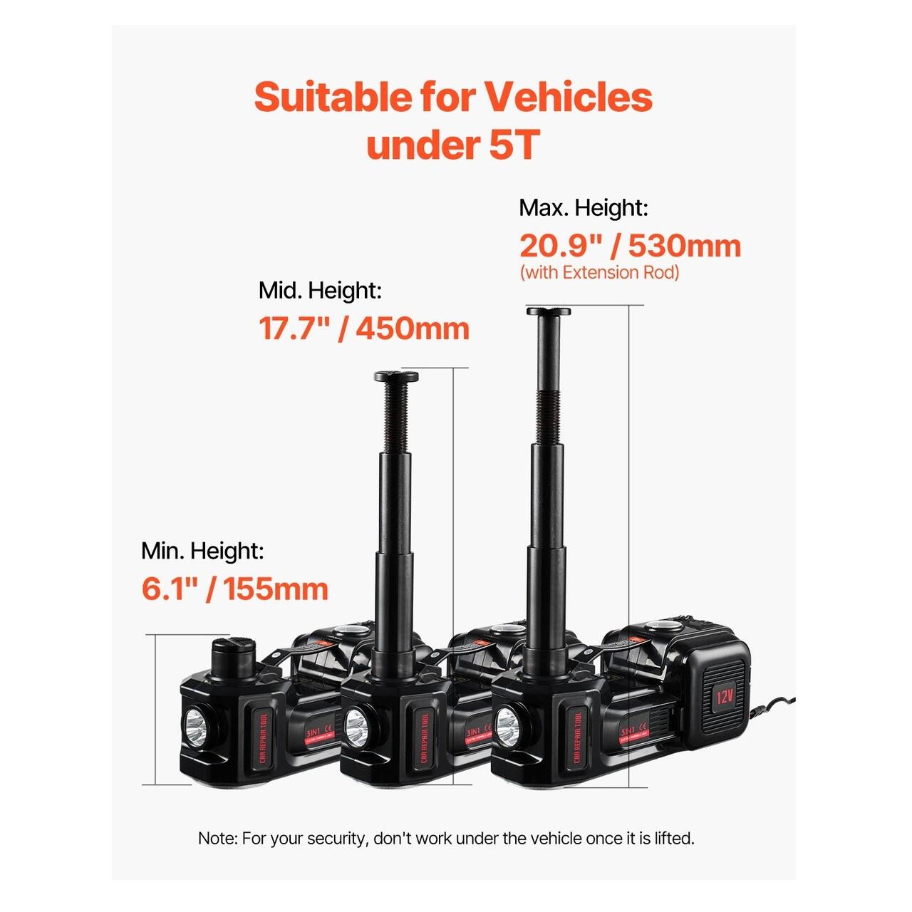 Potrivit pentru vehicule 5T: Proiectat pentru ridicarea anvelopelor simple pe vehicule 5T. Gama de ridicare hidraulica: 155-450 mm (tija scurta), 235-530 mm (tija extinsa), potrivite pentru masini, SUV-uri si vehicule cu garda la sol diferita. Nota: Cricul trebuie utilizat pe o suprafata plana si pozitionat vertical fata de vehicul.