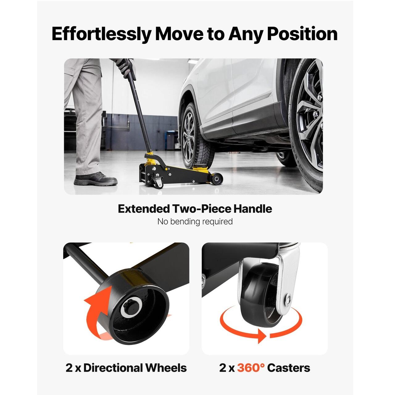 Design usor de utilizat: Acest cric auto robust, cu profil redus, are o structura complet din otel si un cilindru hidraulic etans pentru o ridicare stabila si fiabila. Un maner usor de prins si doua roti pivotante cu doua roti fixe fac cricul de podea usor de manevrat.