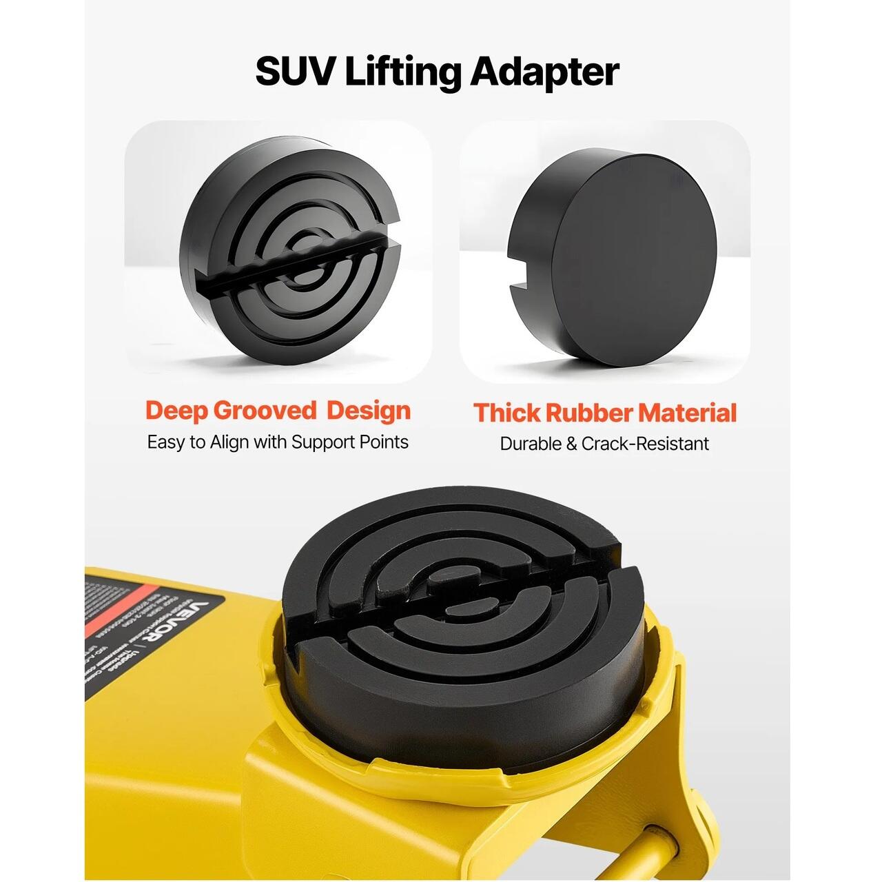 Adaptor SUV: Cricul nostru hidraulic pentru podea include un adaptor din cauciuc pentru SUV cu dimensiunile de 2 x 1,4 in (50 x 36 mm). Designul canelat se aliniaza cu punctele de ridicare pentru SUV. Constructia groasa din cauciuc rezista la crapare si ajuta la asigurarea unei ridicari stabile.
