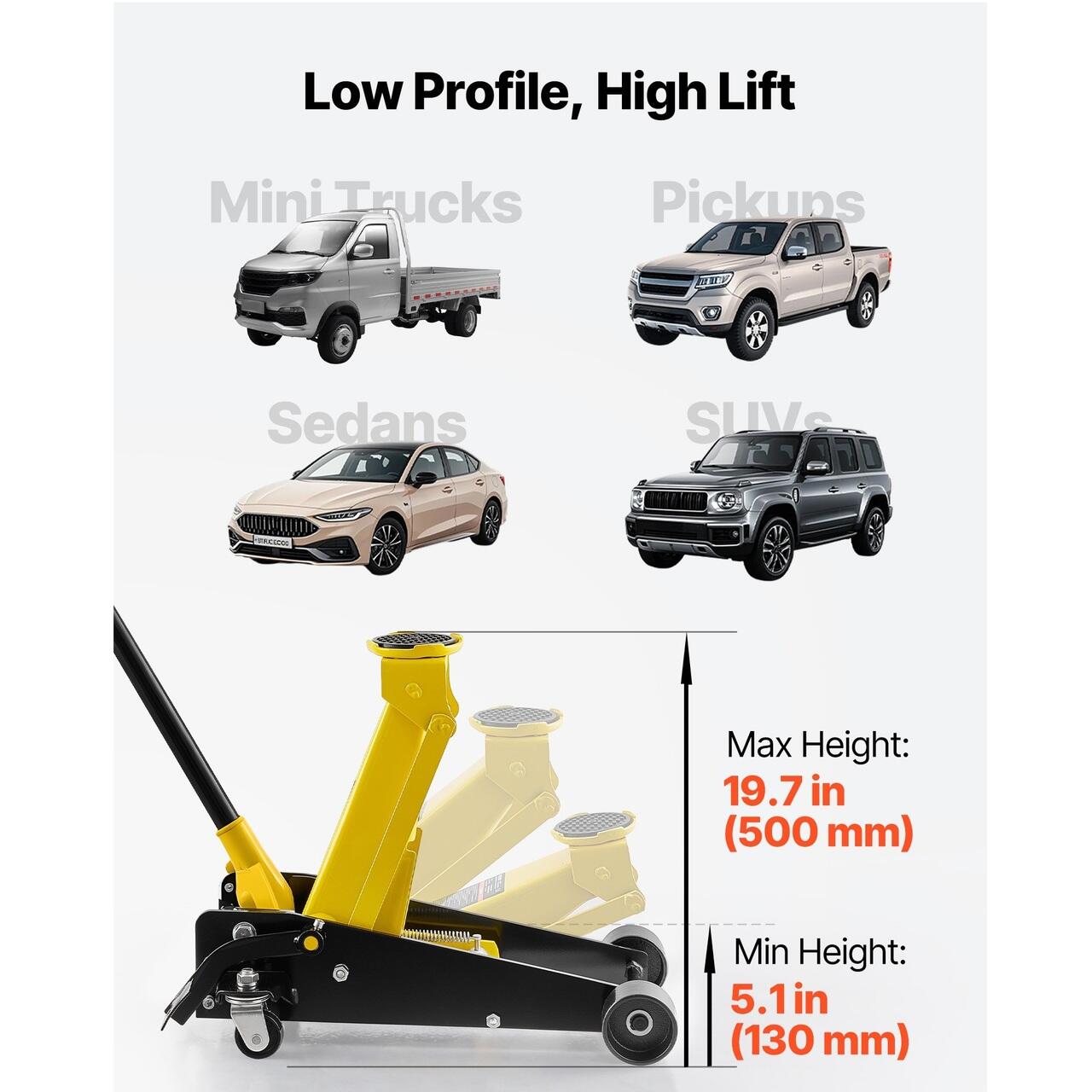 Capacitate maxima 3T: Cricul nostru cu profil redus sustine pana la 3 tone ridicand cu usurinta sedanuri, SUV-uri si camionete. Este ideal pentru schimbarea anvelopelor, service-ul franelor, inlocuirea sistemului de evacuare, intretinerea suspensiei si alte reparatii auto.