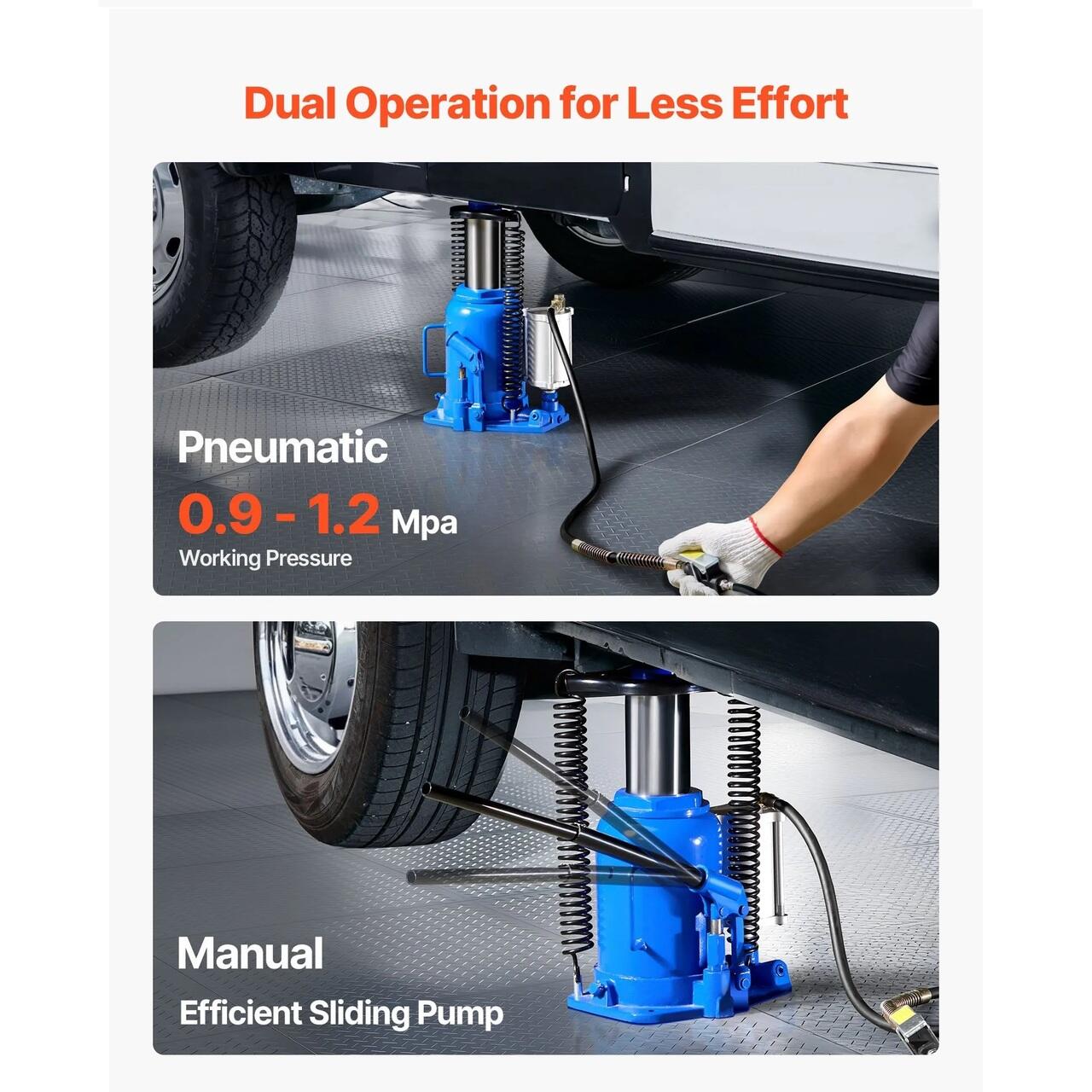 Manual si pneumatic: Ridicati cum doriti cu cricul nostru pentru butelii cu ridicare inalta. Folositi modul pneumatic pentru ridicare rapida si cu efort redus prin intermediul fitingurilor standard cu conectare rapida. Nu aveti aer? Treceti la modul manual si continuati sa lucrati - indiferent daca sunteti in atelier sau pe teren.