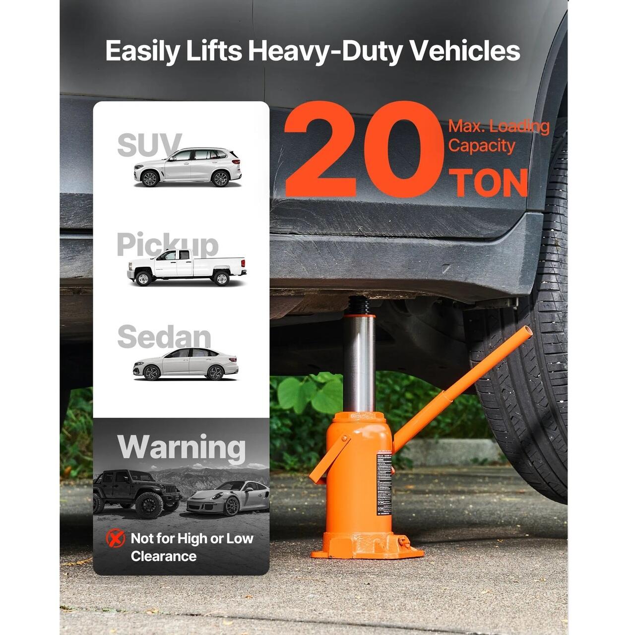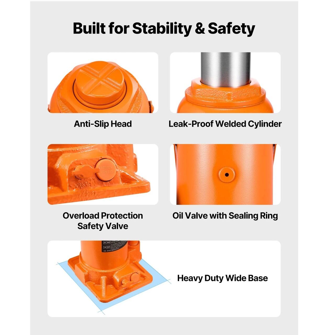 Ridicare stabila: Cricul nostru hidraulic pentru butelii poate gestiona pana la 20 de tone, fiind excelent pentru camioane, rulote, camionete si SUV-uri. Este ideal pentru schimbarea anvelopelor, inspectii rapide si chiar pentru ridicarea echipamentelor agricole si a utilajelor de constructii.