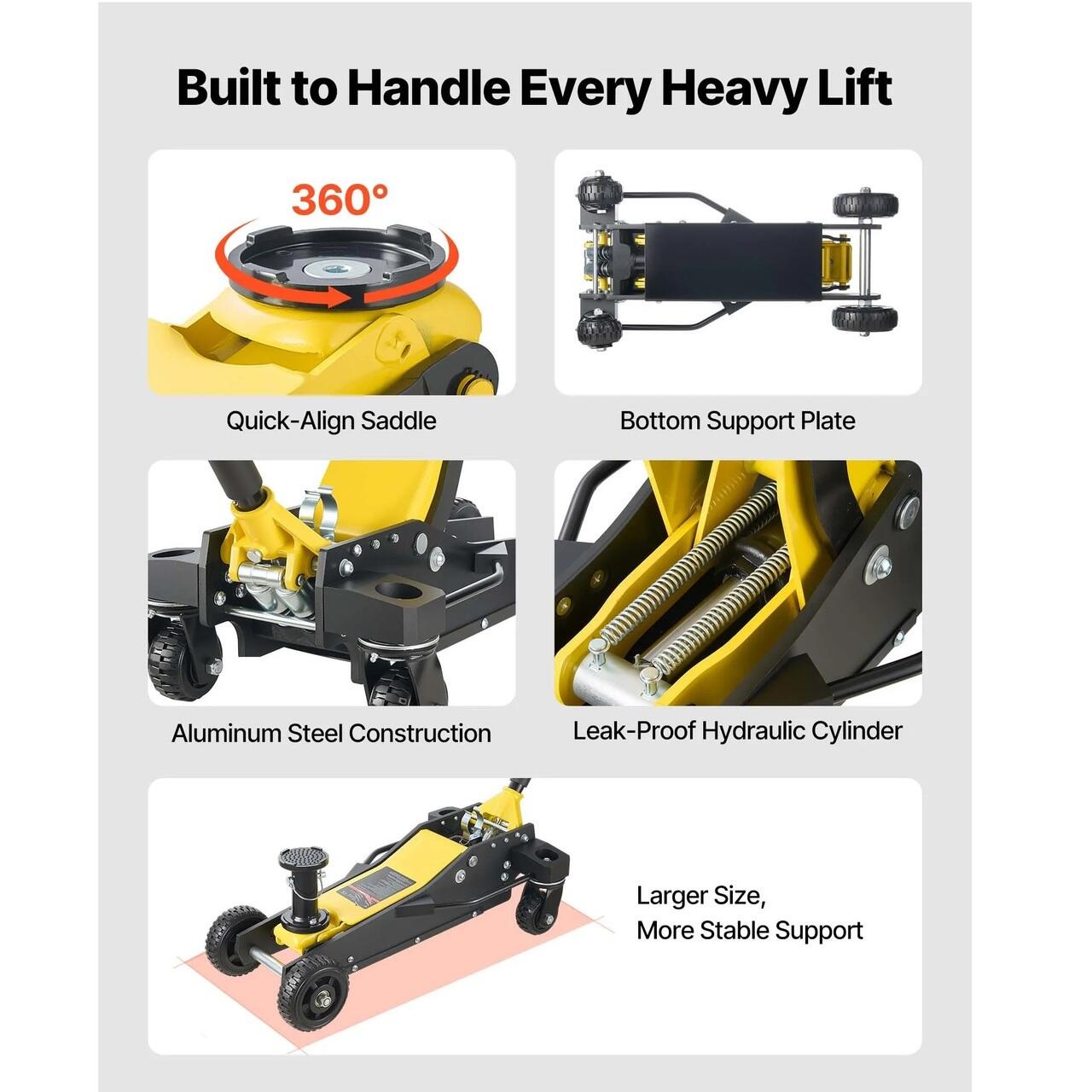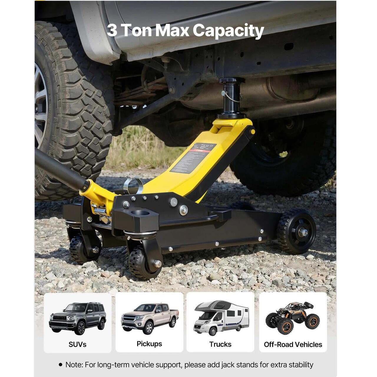 Capacitate maxima 3T: Cricul nostru de podea cu ridicare inalta sustine pana la 3 tone (6.614 lbs). Ridica vehicule off-road, SUV-uri, pickup-uri si camioane. Ideal pentru schimbarea anvelopelor, service-ul franelor, lucrarile la suspensie si alte lucrari la sasiu. Folositi suporturile pentru suport pe termen lung.
