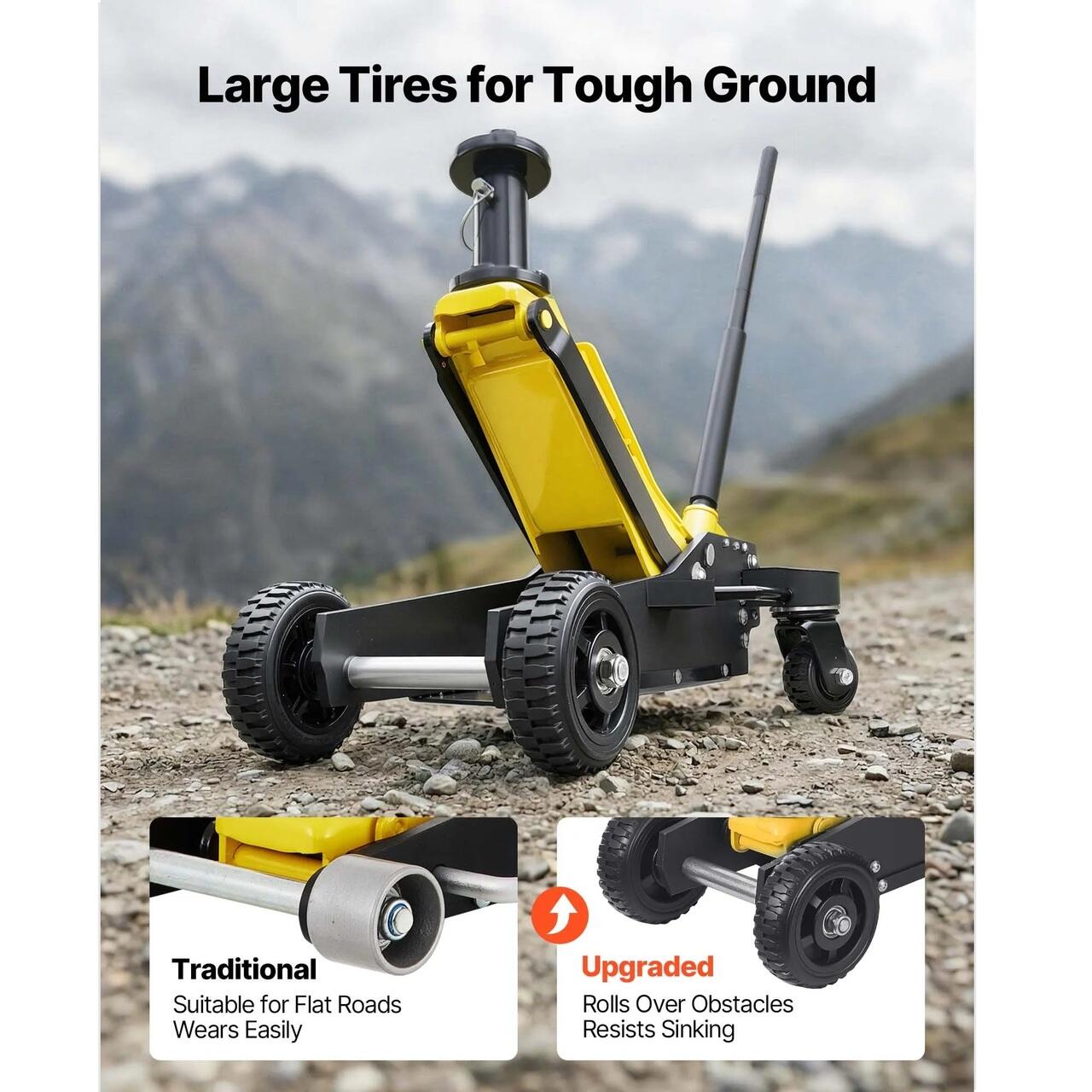 Roti cu diametru mare: Cricul hidraulic pentru podea off-road are patru roti cu diametru mare. Se rostogoleste lin pe drumuri accidentate, cu dale si pietris. Banda de rulare adanca imbunatateste tractiunea, in timp ce placa de baza ajuta la reducerea scufundarii in timpul ridicarii in aer liber.