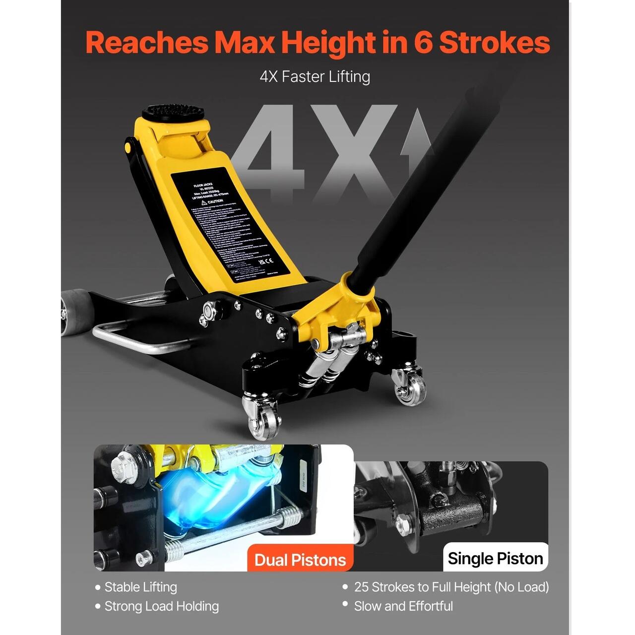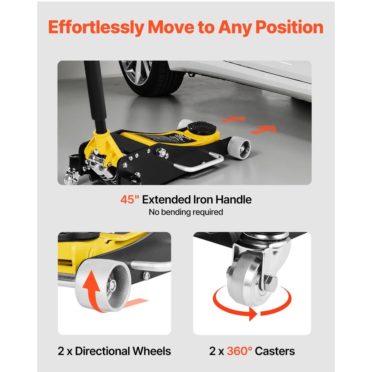 Sarcina maxima de 2,5 tone: Cricul nostru de podea sustine 2,5 tone (5500 lbs), ideal pentru ridicarea masinilor sport, sedanurilor si SUV-urilor compacte. Este fiabil pentru intretinerea locuintei, schimbarea anvelopelor, verificarea franelor, lucrari la evacuare sau suspensie. Pentru o sustinere extinsa, utilizati cu suporturi pentru cric.