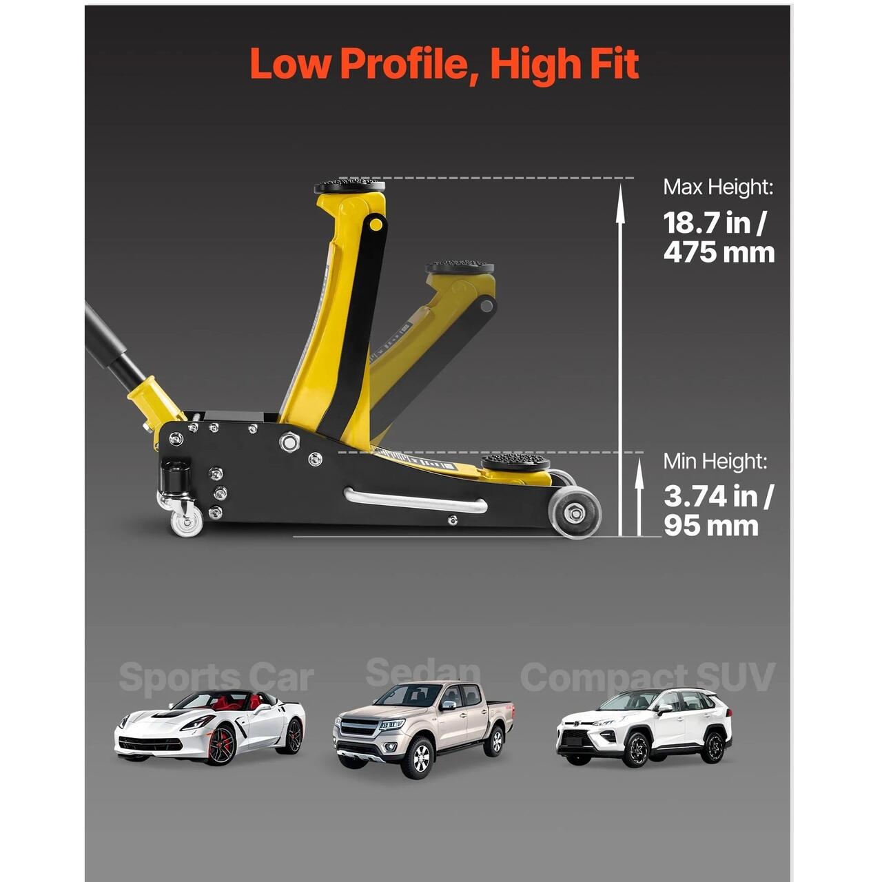 Interval de ridicare: Cricul nostru cu profil redus ridica intre 95 si 475 mm. Acesta aluneca sub masini sport sau sedanuri cu garda la sol redusa, atingand o inaltime mare. Strangeti supapa de eliberare si pompa pentru a ridica, rotiti manerul extins in sens invers acelor de ceasornic pentru a cobori usor.