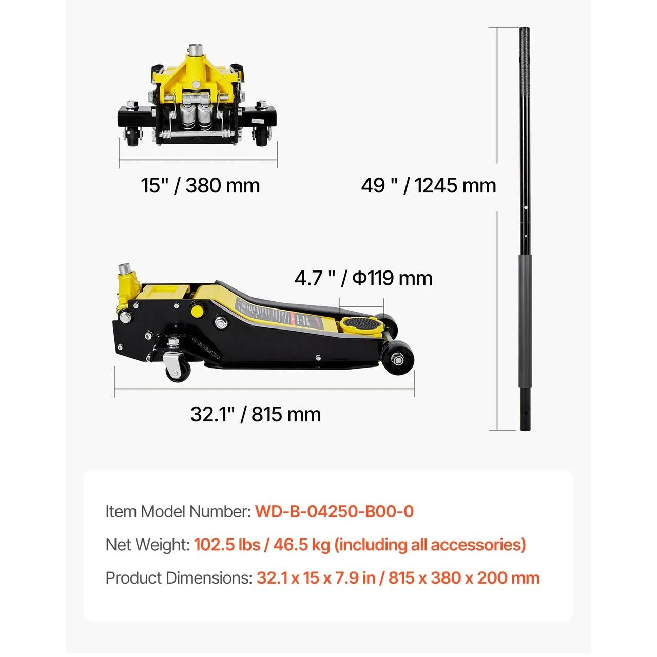 Constructie robusta din fier: Cricul nostru hidraulic de podea din fier ofera durabilitate si stabilitate superioare, reducand oscilatiile sub sarcini grele. Este ideal pentru reparatii auto si uz industrial. Manerul din otel ingrosat rezista la ridicari repetate fara a se rupe.