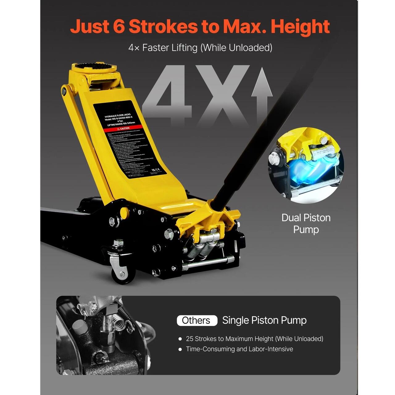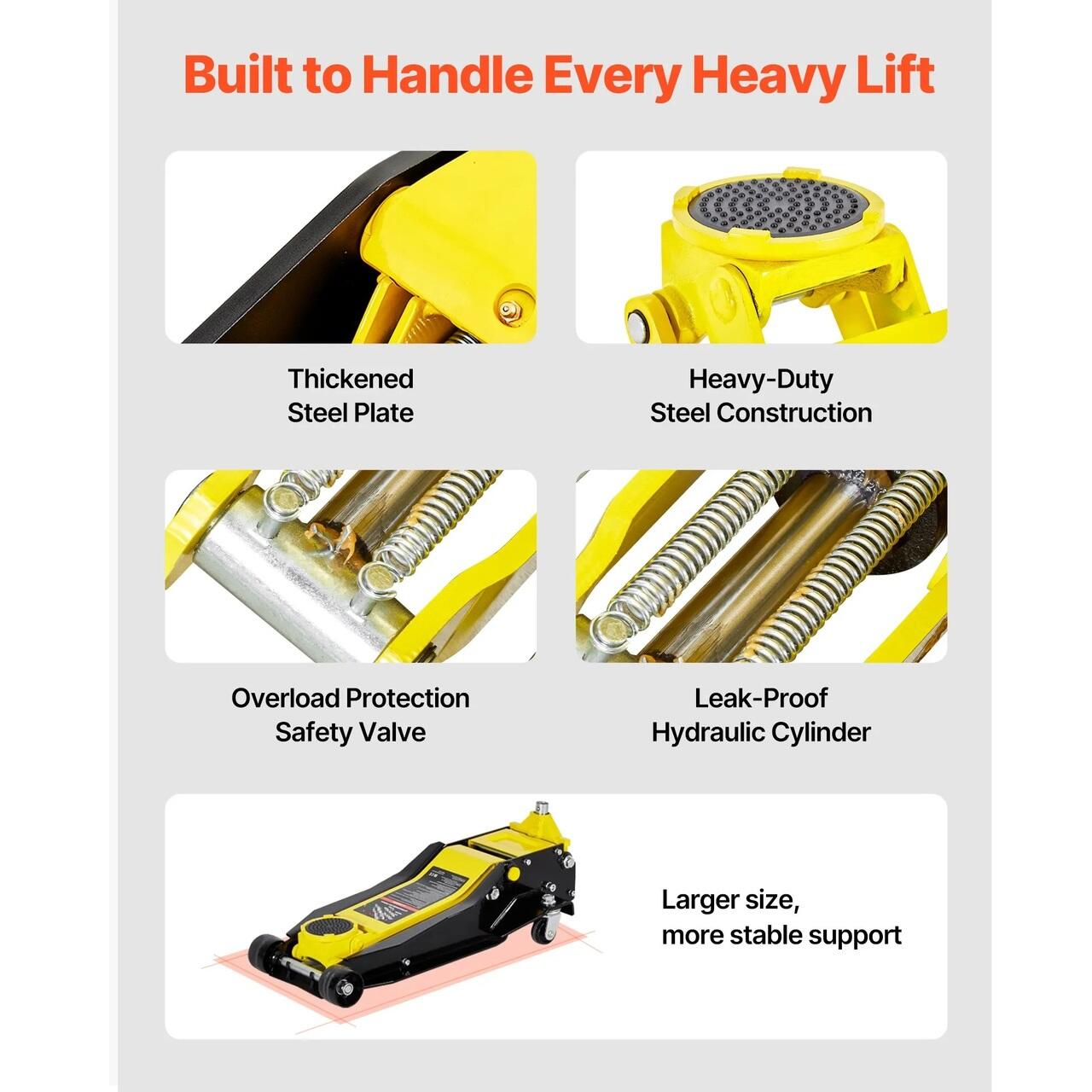 Ridicare rapida cu pompa dubla: Sistemul hidraulic cu doua pistoane face ridicarea vehiculului mai rapida si mai eficienta. Cricul de podea este dotat cu o supapa de eliberare incorporata fiabila pentru a evita deteriorarea cauzata de supraincarcare. Cilindrul ranforsat si etans minimizeaza scurgerile de ulei.