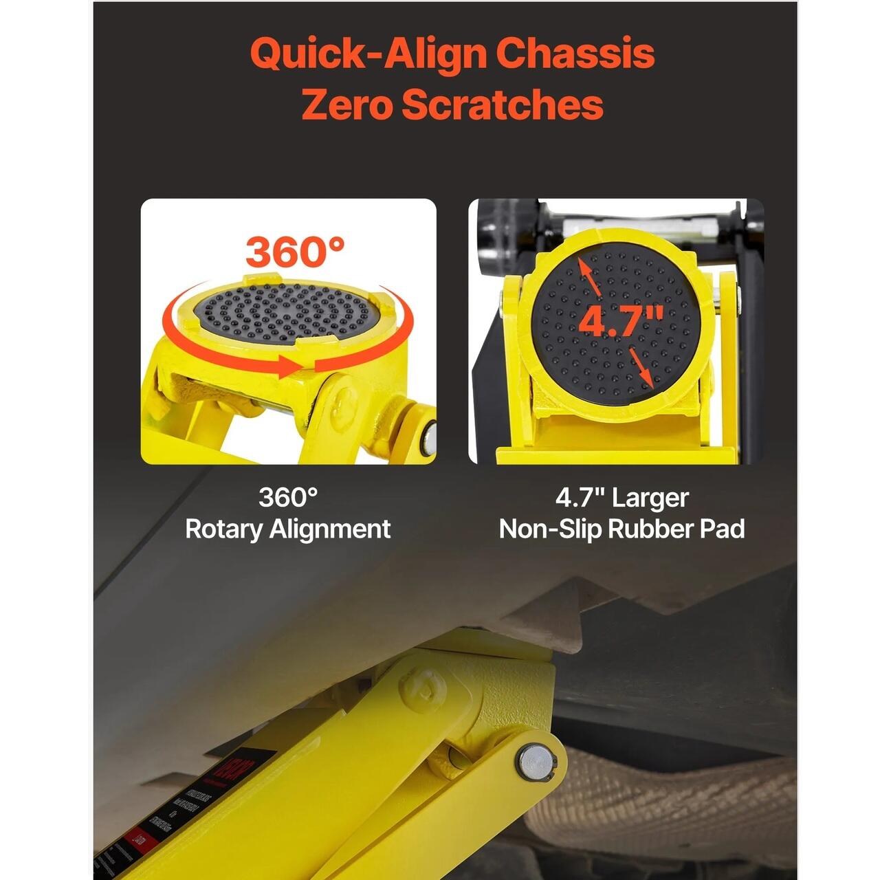 Perna de cauciuc si maner lung: Saua rotativa permite o aliniere precisa cu punctul de ridicare, oferind in acelasi timp protectie suplimentara. Acest cric din otel are un maner extins si roti cu rulare lina, facilitand pozitionarea sub masina.