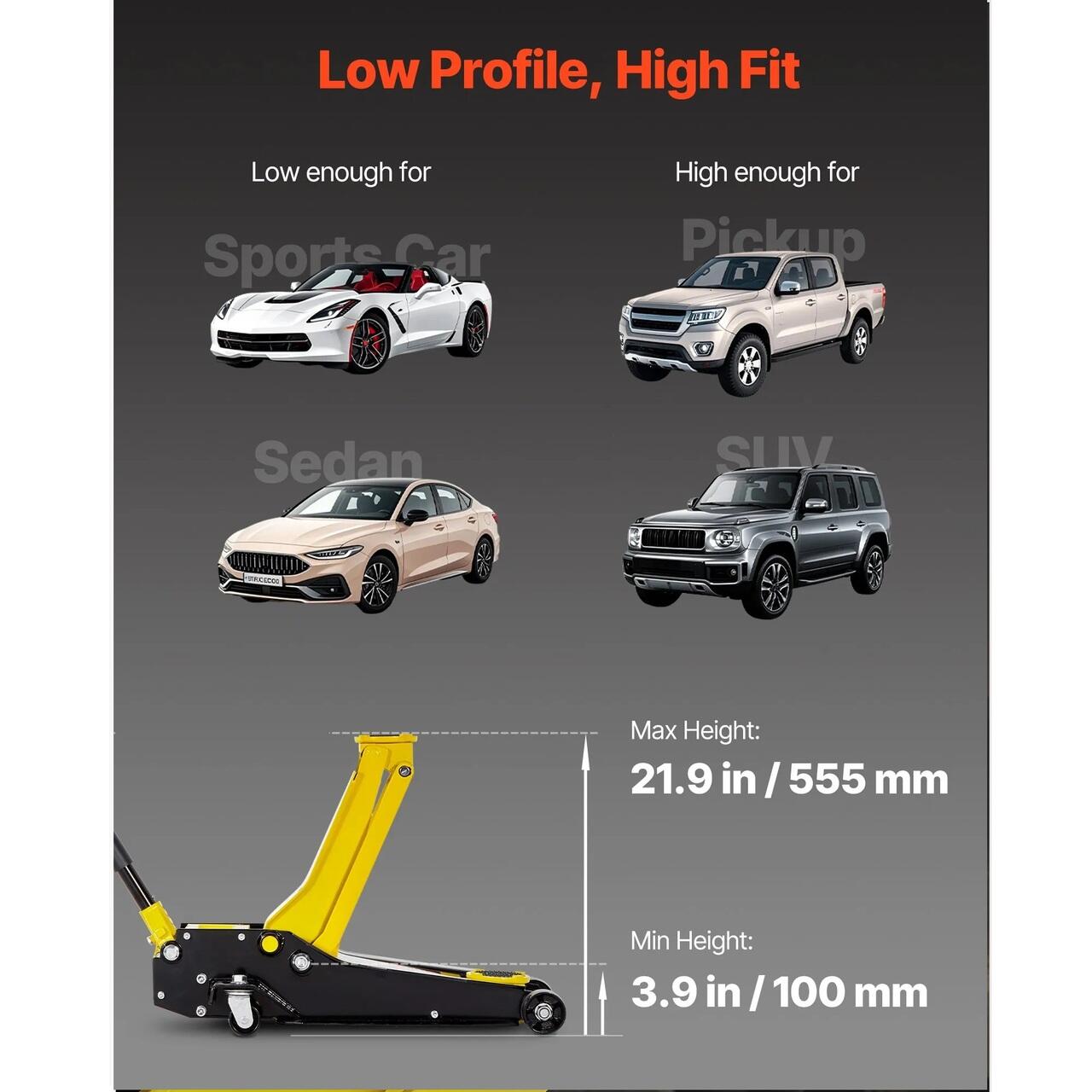 Capacitate maxima de 4 tone: Cricul nostru cu profil redus ridica masini sport, sedanuri, camionete usoare si SUV-uri de pana la 4 tone pentru schimbarea anvelopelor, reparatii si curatare. Este ideal pentru profesionisti sau mesteri amatori. Nota: Pentru intretinere indelungata, utilizati un suport de cric.