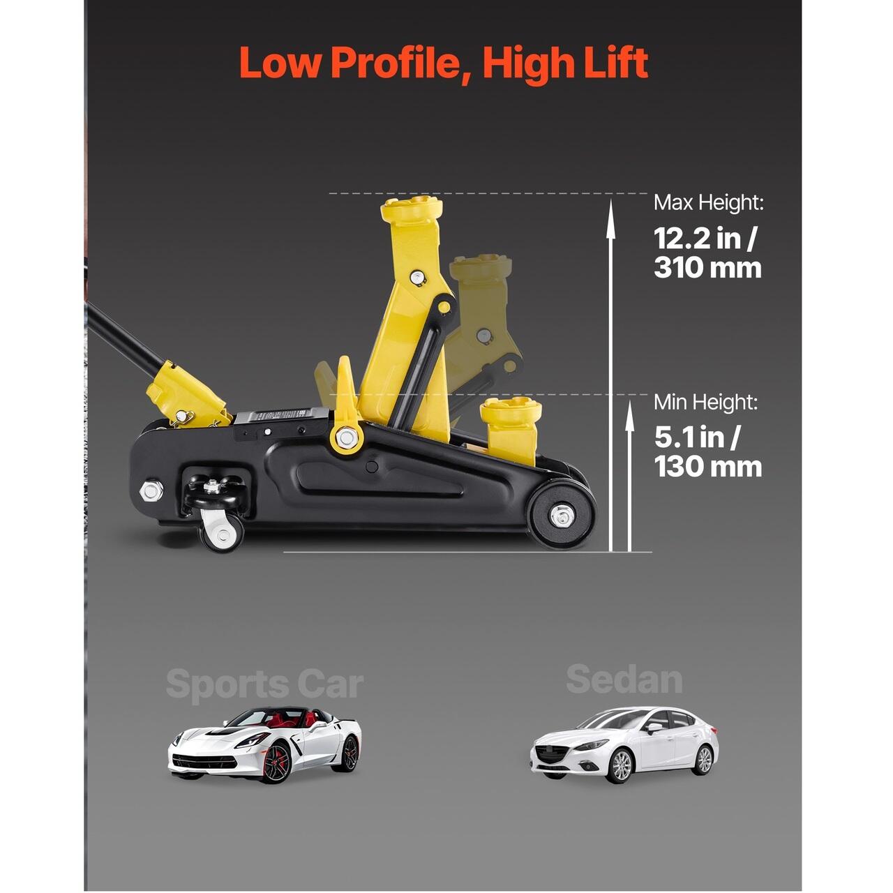 Interval de ridicare: Cricul nostru cu profil redus ridica intre 130 si 310 mm. Se gliseaza usor sub masini sport sau sedanuri cu garda joasa, atingand o inaltime mare. Strangeti supapa de eliberare si pompa pentru a ridica, apoi rotiti manerul in sens invers acelor de ceasornic pentru a cobori usor.