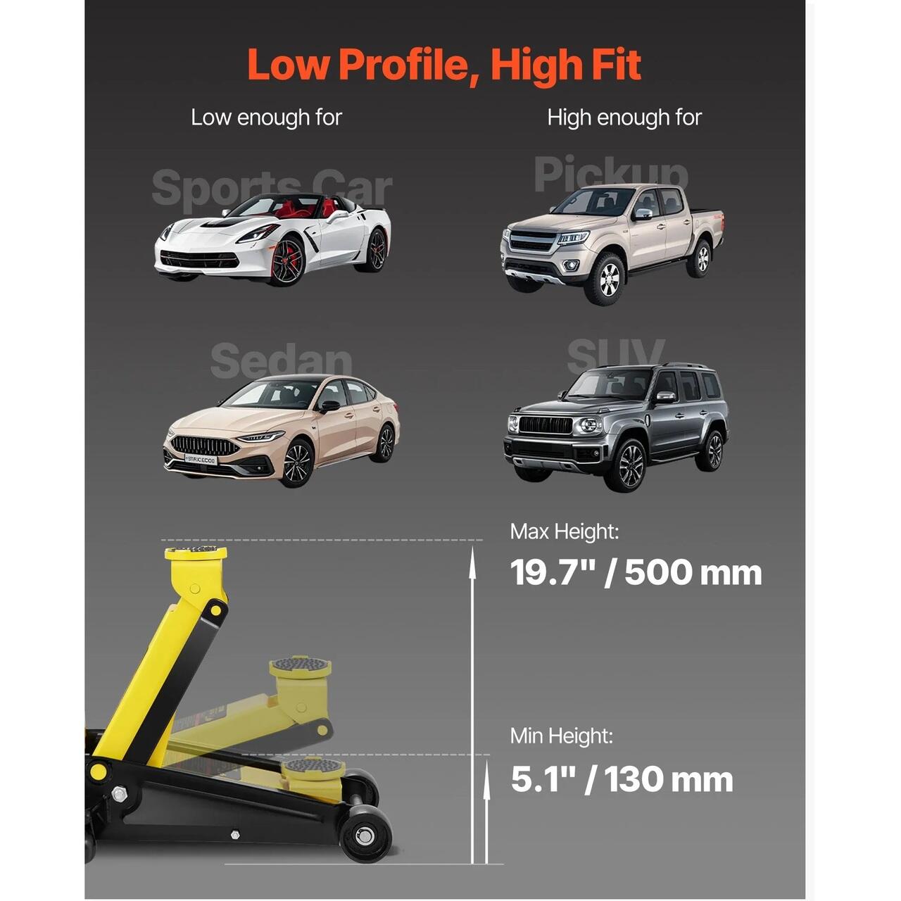 Pentru toate nevoile dumneavoastra de ridicare: Inaltime minima: 5,12"/130 mm. Inaltime maxima: 19,7"/500 mm. Gama larga de ridicare satisface nevoile dumneavoastra de ridicare a masinilor de familie, camioanelor, SUV-urilor etc. Iar o pompa hidraulica rapida cu un singur piston va permite sa pompati cu usurinta cricul la inaltimea dorita.