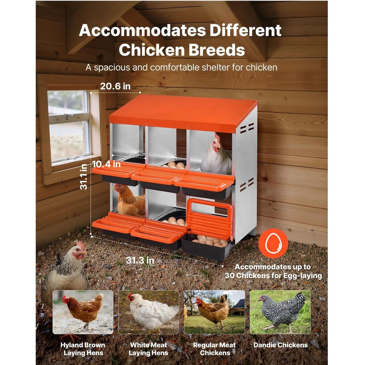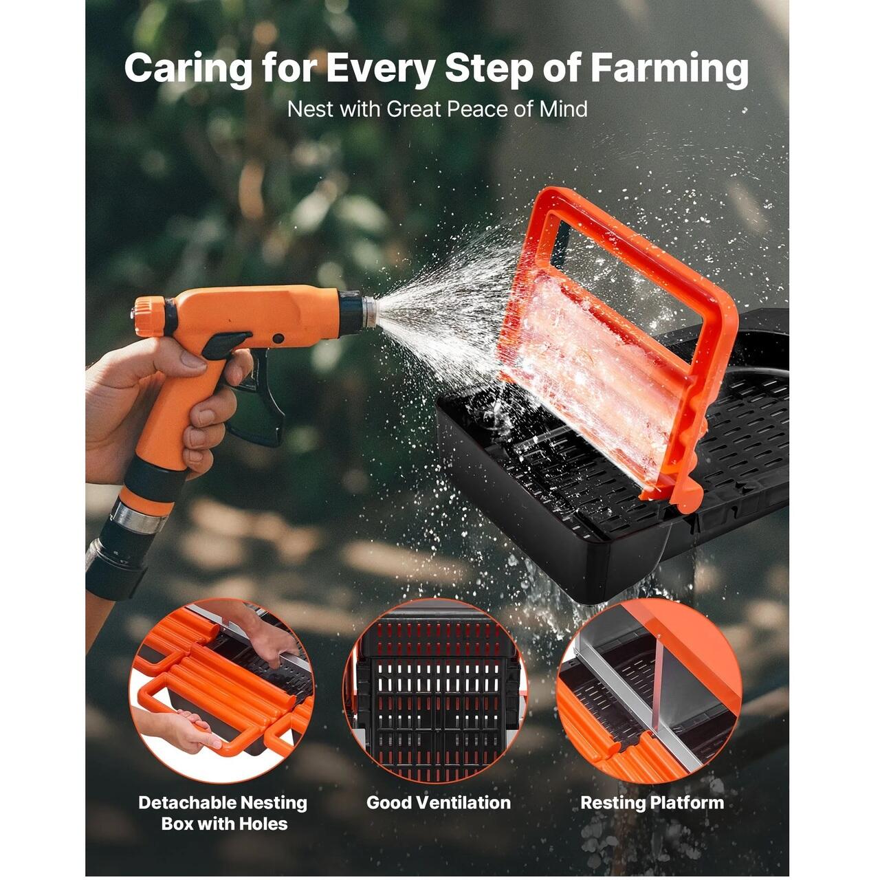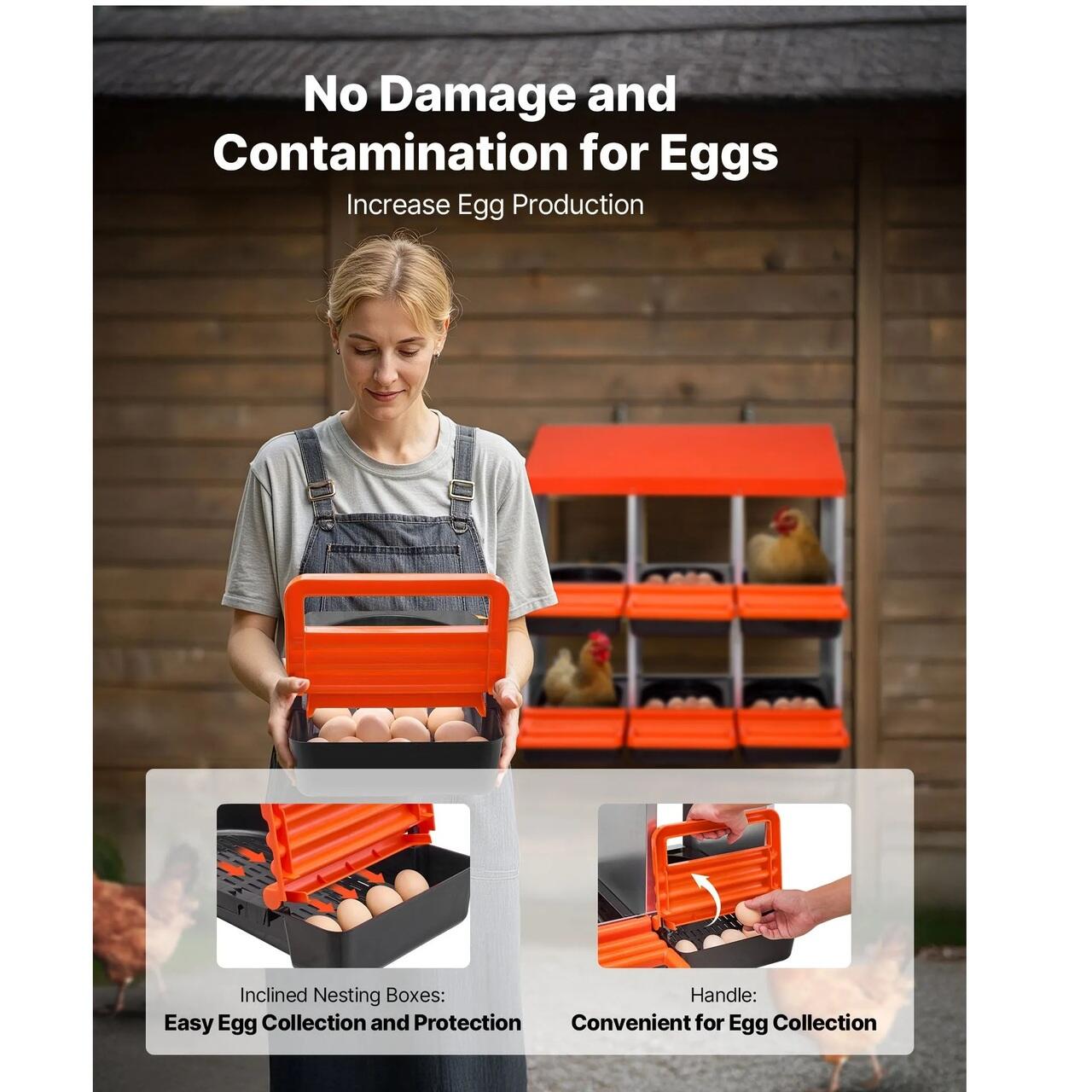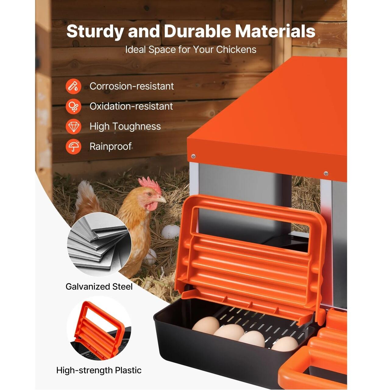 Usor de curatat: Aceste cuiburi pentru gaini sunt prevazute cu orificii de drenaj pentru a evita acumularea de apa si a permite patrunderea resturilor. Au o tava detasabila pentru curatare rapida, orificii de ventilatie pentru aer proaspat si o platforma de odihna pentru intrarea gainilor.