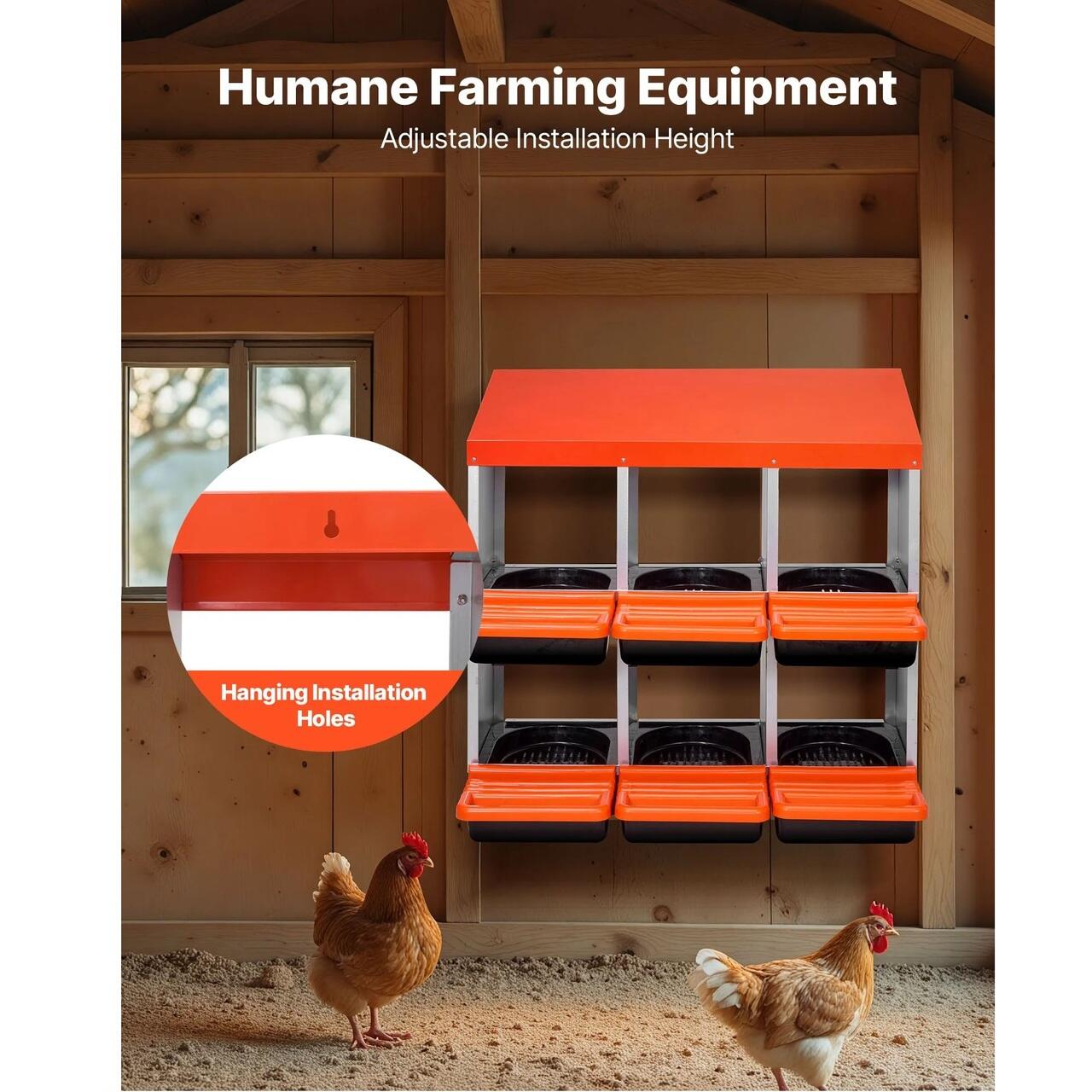 Spatiu spatios pentru cuibarit: Cuiburile noastre pentru gaini au un design usor de curatat, cu 6 compartimente, cu un singur strat (762–1067 mm), fiecare cu o latime de 265 mm, potrivit pentru diverse rase de gaini. O cutie poate gazdui pana la 5 oua de gaina pentru o ouare eficienta