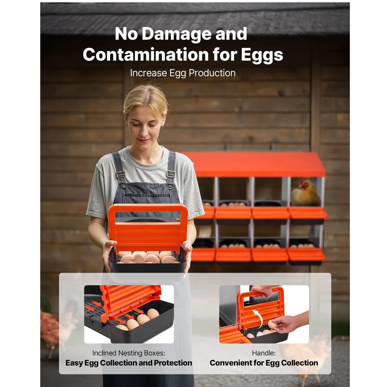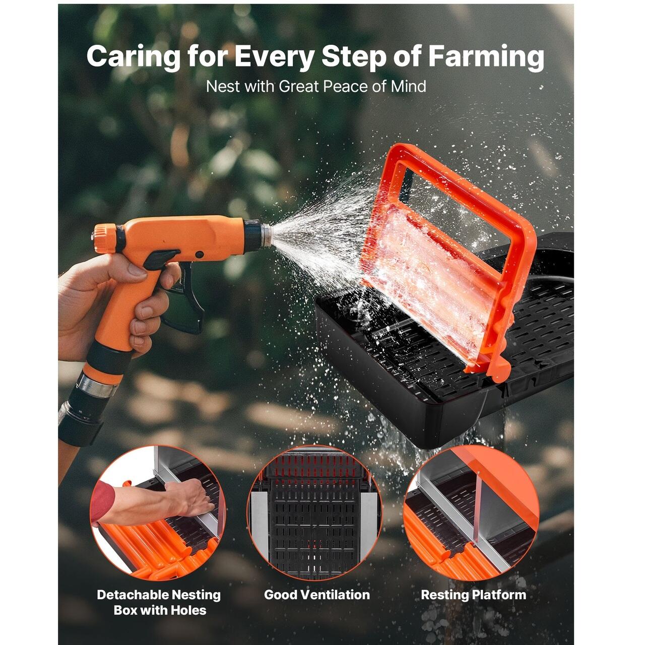 Usor de curatat: Aceste cuiburi pentru gaini sunt prevazute cu orificii de drenaj pentru a evita acumularea de apa si a permite patrunderea resturilor. Au o tava detasabila pentru curatare rapida, orificii de ventilatie pentru aer proaspat si o platforma de odihna pentru intrarea gainilor.