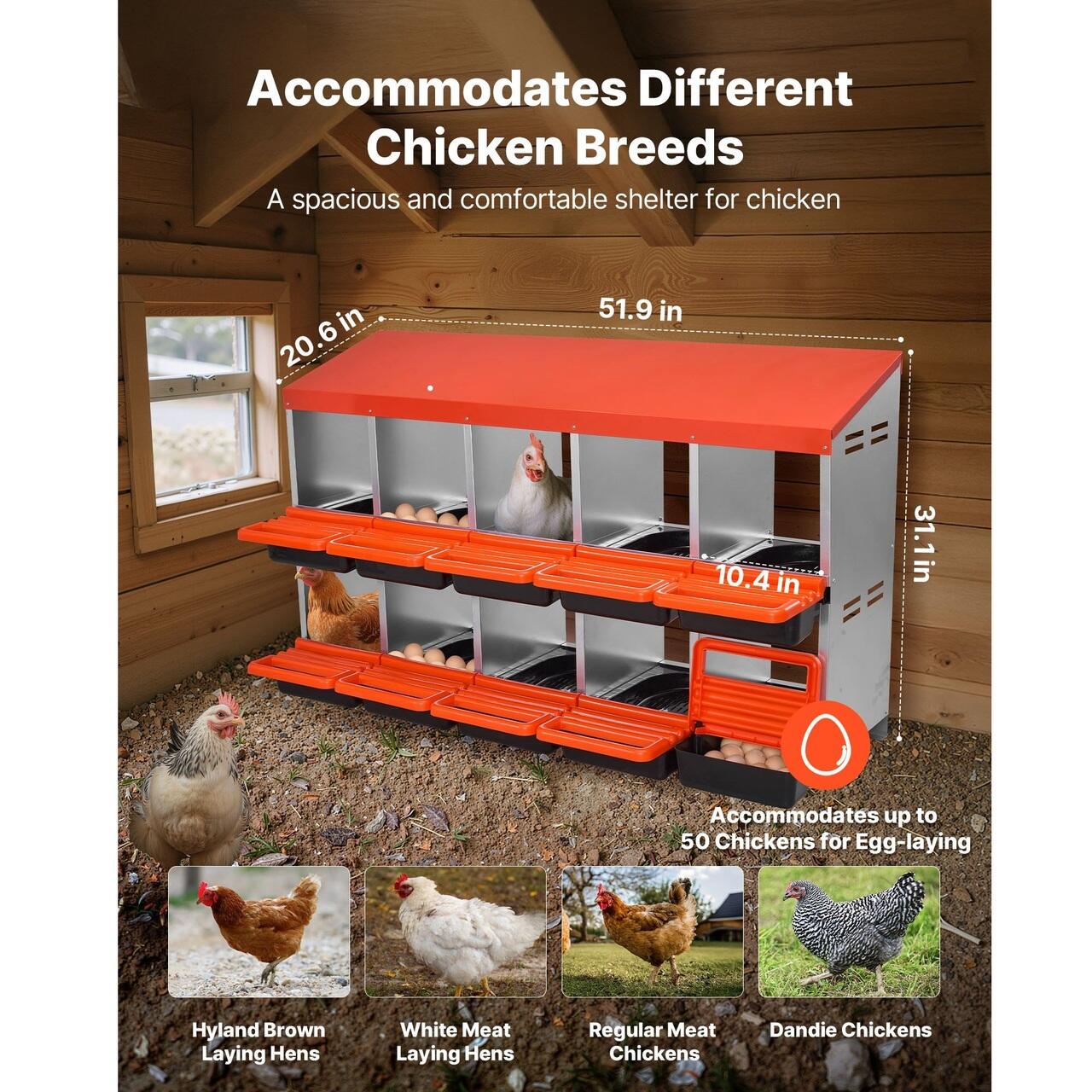 Spatiu spatios pentru cuibarit: Cuiburile noastre pentru gaini au un design usor de curatat, cu 10 compartimente, cu un singur strat (762–1067 mm), fiecare cu o latime de 265 mm, potrivit pentru diverse rase de gaini. O cutie poate gazdui pana la 5 oua de gaina pentru o ouare eficienta.