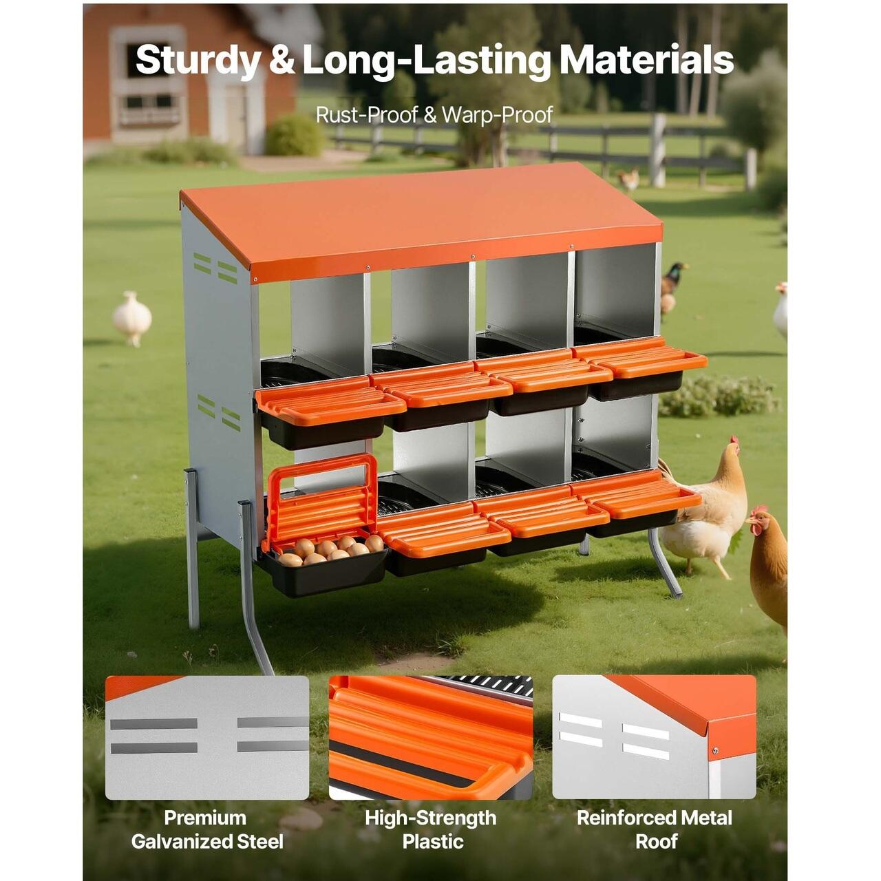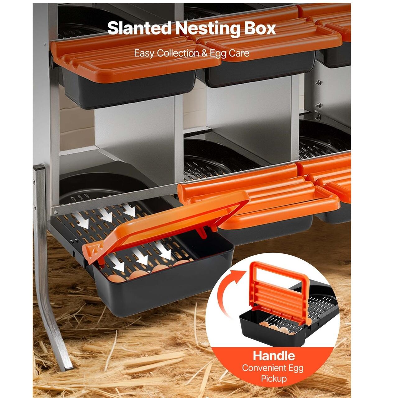 Robuste si durabile: Fabricate din otel galvanizat de inalta calitate si plastic usor de curatat, aceste cuiburi pentru gaini rezista la ciugulit si rugina. Grinda frontala lata sporeste stabilitatea, reducand la minimum oscilatiile si oferind un mediu de ouat linistit si sigur.
