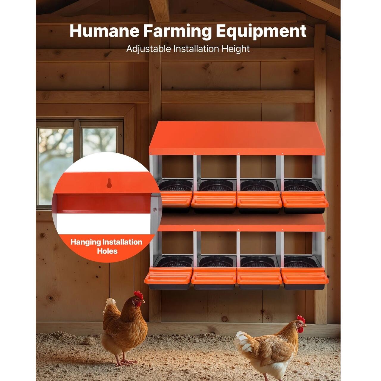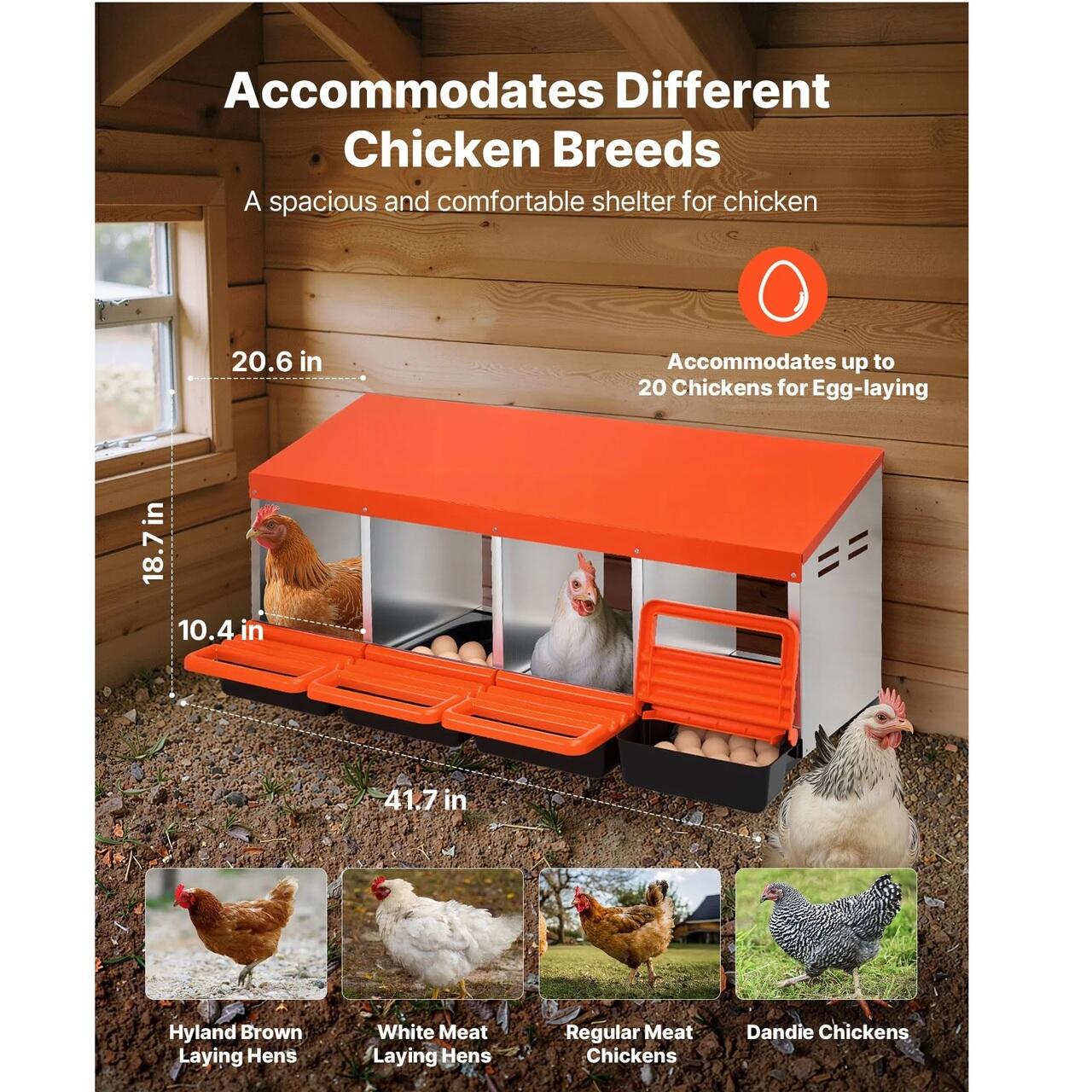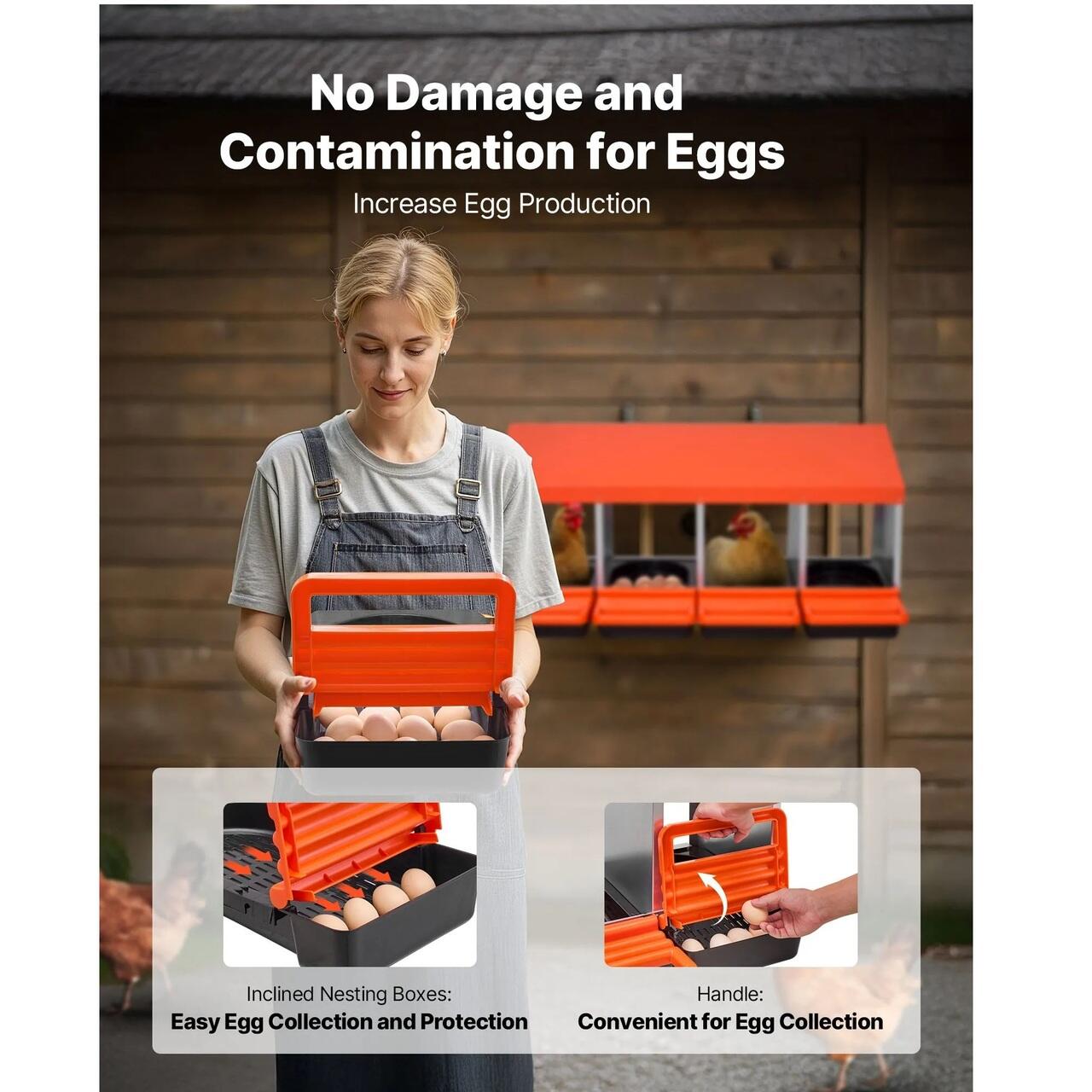 Spatiu spatios pentru cuibarit: Cuiburile noastre pentru gaini au un design usor de curatat, cu 4 compartimente, cu un singur strat (15–30 in/381–762 mm), fiecare cu o latime de 10,4 in (265 mm), potrivit pentru diverse rase de gaini. O cutie poate gazdui pana la 5 oua de gaina pentru o ouare eficienta.
