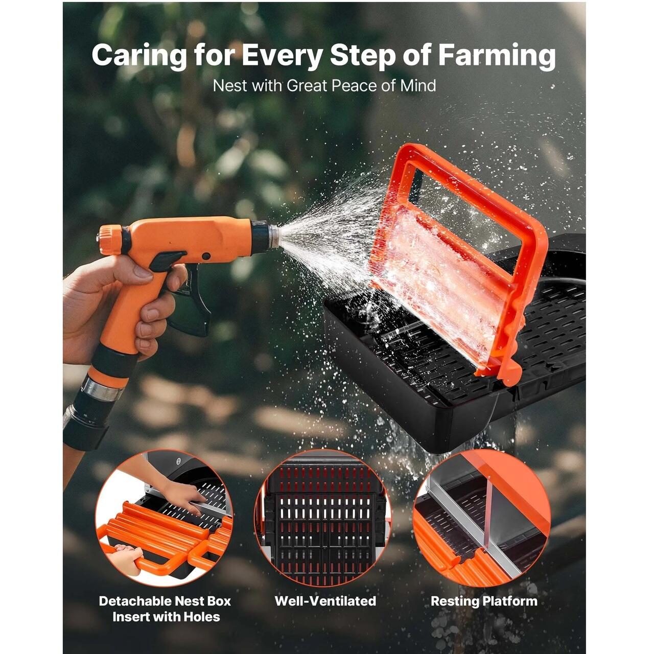 Usor de curatat: Tavile detasabile cu orificii de drenaj evita acumularea de apa si resturi. Ventilatia din boxele de ouat pentru gaini asigura circulatia aerului, iar o platforma larga de aterizare faciliteaza accesul si odihna, simplificand curatarea si sustinand productia eficienta de oua.