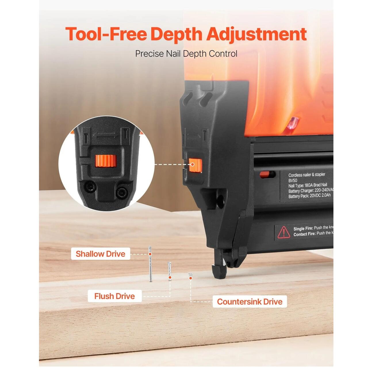 Reglarea adancimii fara unelte: Pistolul nostru de cuie alimentat de batut cuie cu baterii stabileste cu usurinta adancimea ideala a cuiului fara unelte suplimentare. Comutati rapid intre diferite materiale si proiecte, asigurandu-va in acelasi timp ca fiecare cui este batut la adancimea precisa pentru un finisaj impecabil.