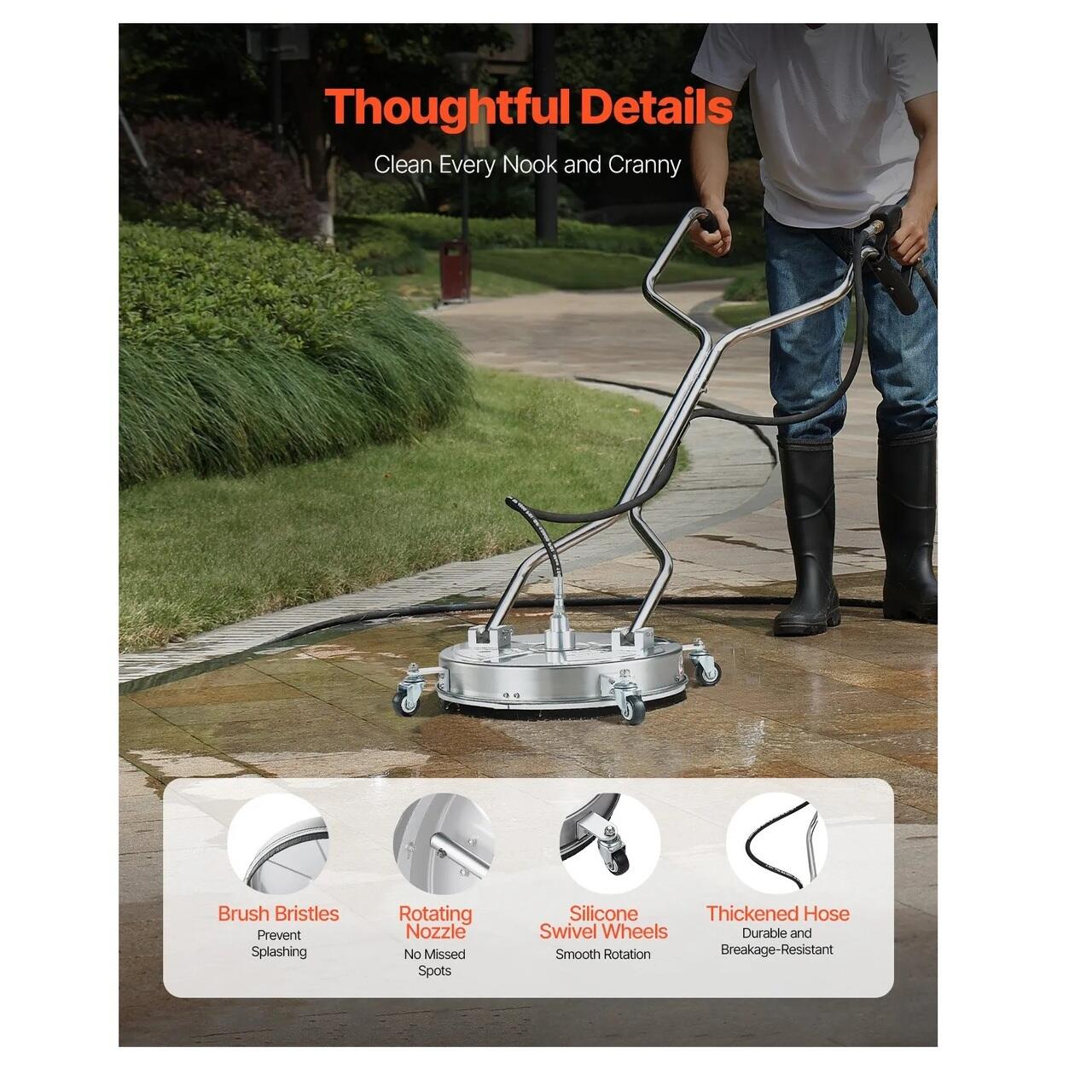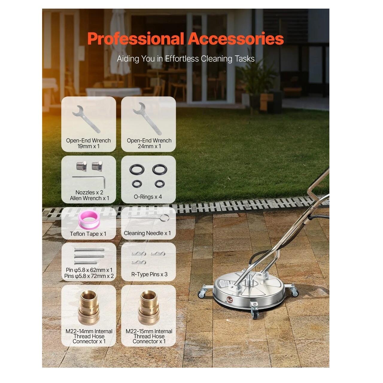 Maner dublu cu design rotativ: Manerul reglabil si rotativ si rotile pivotante va permit sa schimbati directiile de curatare fara efort. In plus, duzele rotative si perii periei va ajuta sa va mentineti uscat, oferind in acelasi timp o curatare temeinica. Accesorii profesionale: Acest aparat de curatat suprafete cu presiune vine cu toate accesoriile de care aveti nevoie, inclusiv conectori pentru furtun si un kit adaptor, astfel incat sa puteti incepe imediat. De asemenea, am inclus un ac cu orificiu traversant pentru a curata orice blocaje care ar putea aparea, mentinandu-va in actiune.