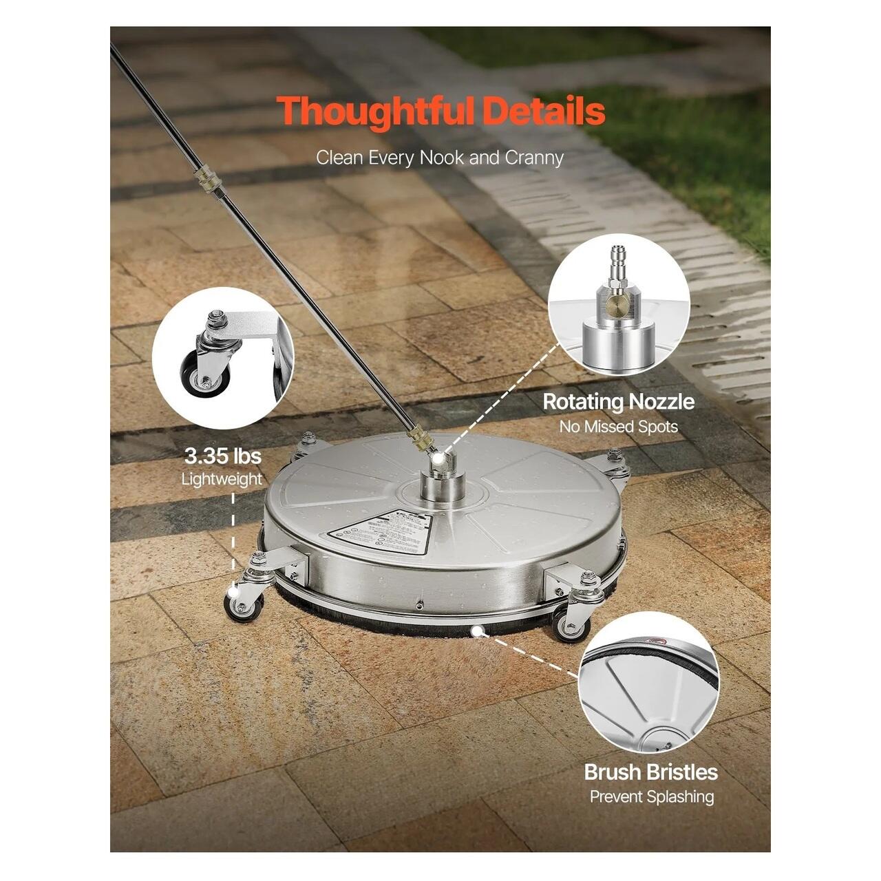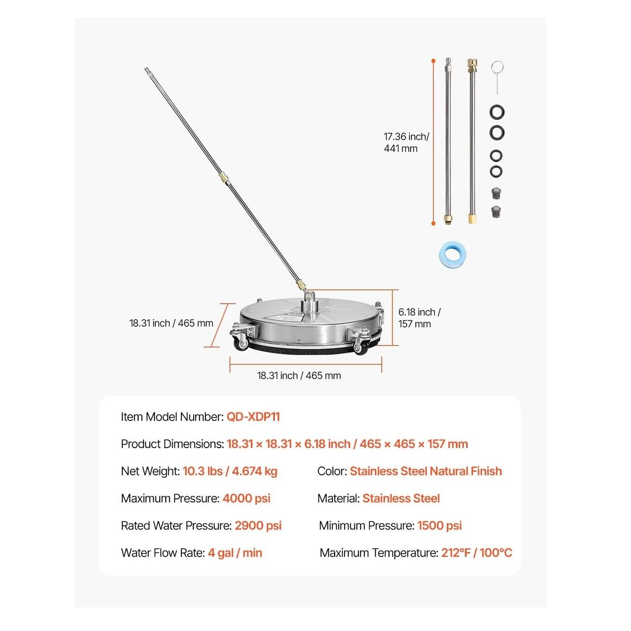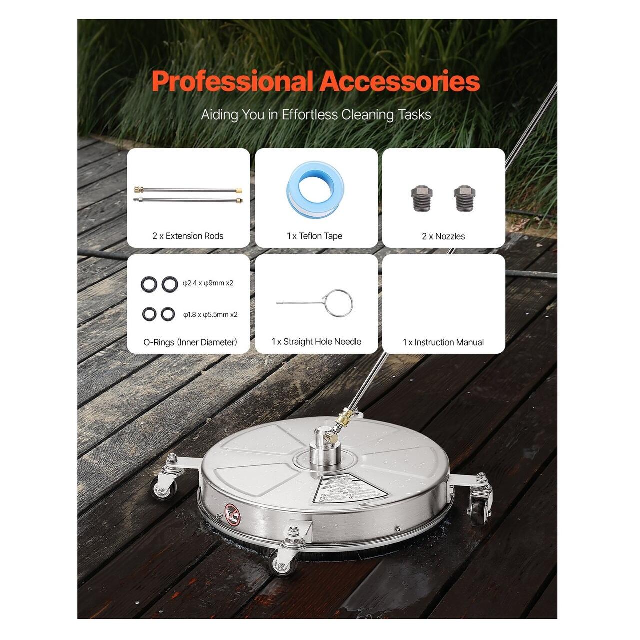 Accesorii profesionale: Acest aparat de curatat suprafete cu presiune vine cu o varietate de accesorii profesionale, inclusiv conectori pentru furtun si un kit adaptor pentru o asamblare mai rapida si o curatare imediata. In plus, este inclus un ac cu orificiu traversant pentru a rezolva cu usurinta orice problema de infundare.