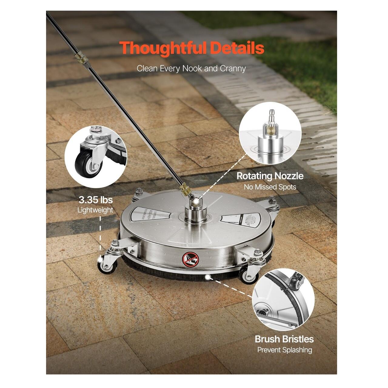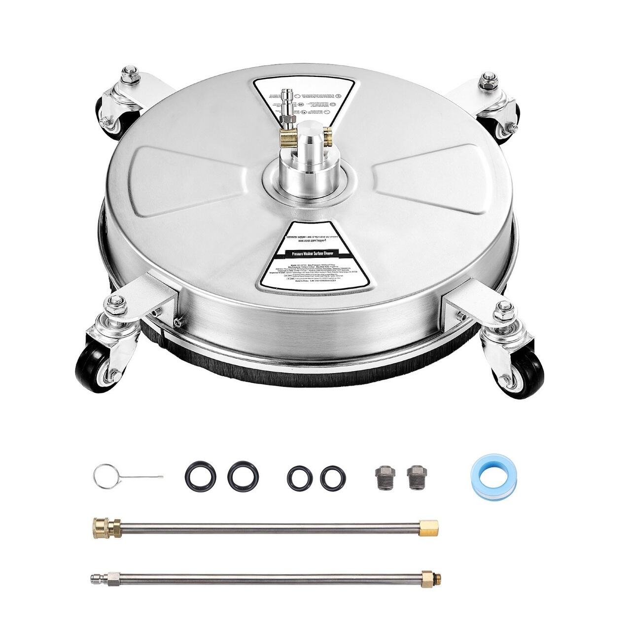 Accesorii profesionale: Acest aparat de curatat suprafete cu presiune vine cu o varietate de accesorii profesionale, inclusiv conectori pentru furtun si un kit adaptor pentru o asamblare mai rapida si o curatare imediata. In plus, este inclus un ac cu orificiu traversant pentru a rezolva cu usurinta orice problema de infundare.