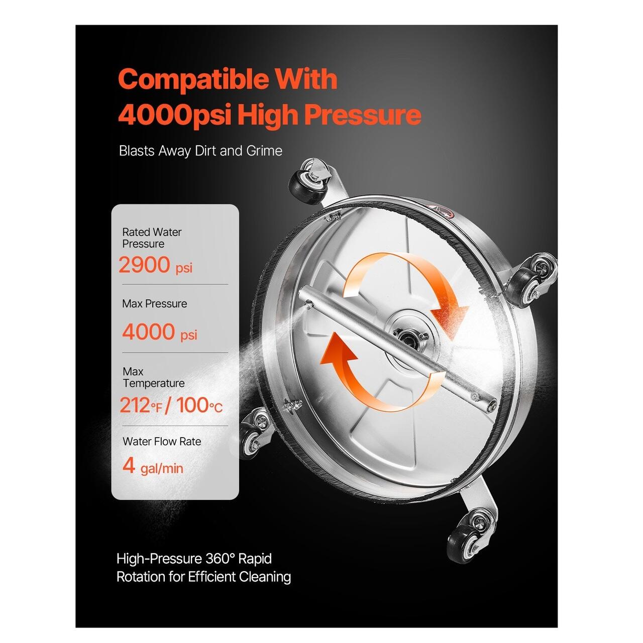 Presiune puternica de 4000 PSI: Cu o presiune nominala de 2900 PSI si o presiune maxima de 4000 PSI, duzele inferioare cu rotatie dubla la 360° elimina rapid murdaria si resturile. Gata cu petele dificile.
