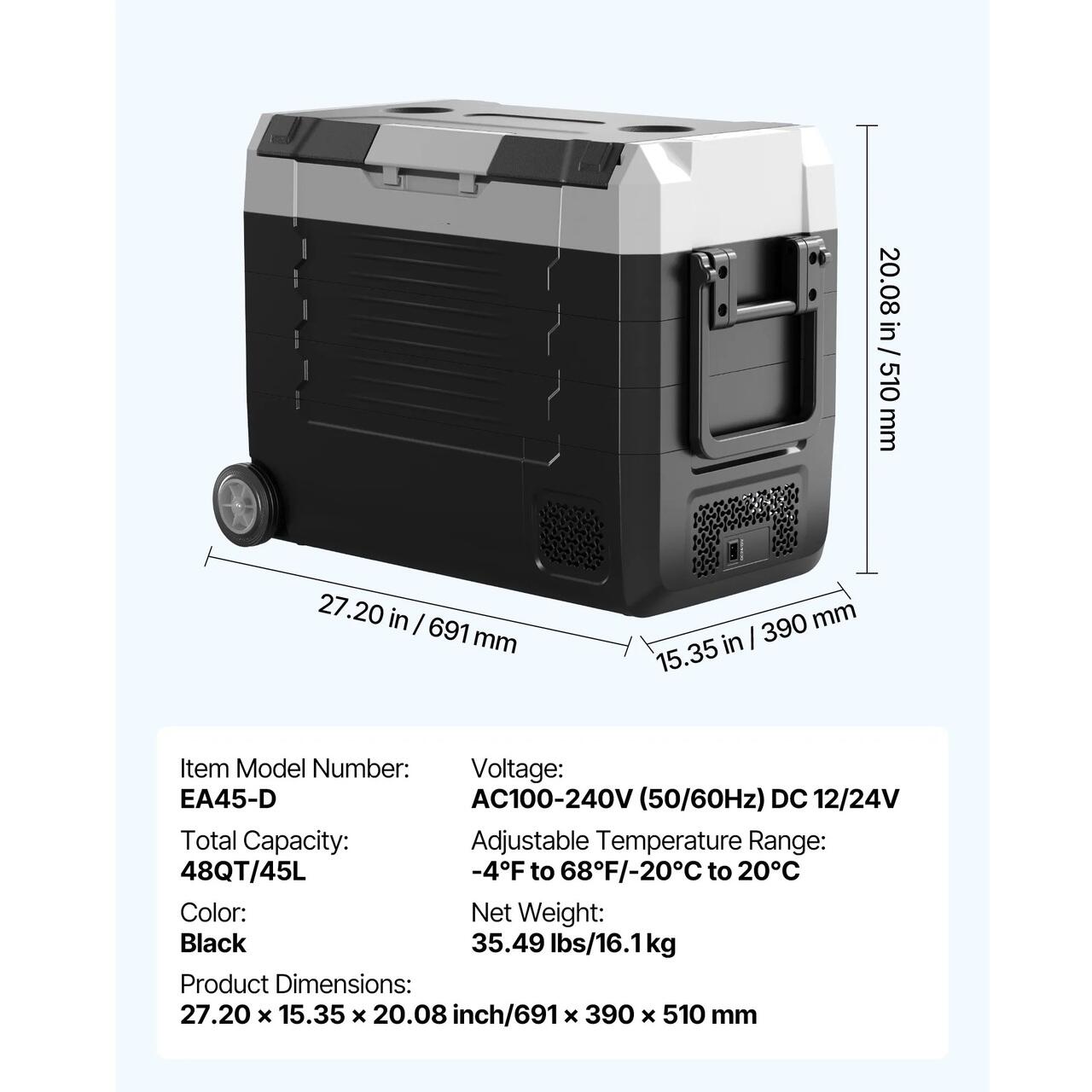 Flexibilitate cu alimentare dubla: Suportand 12/24V CC si 110–240V CA, racitorul auto se adapteaza nevoilor de alimentare ale vehiculului sau ale gospodariei. Constructia sa compacta este potrivita pentru rulote, masini, camioane si autoutilitare, iar rotile cu rulare lina, impreuna cu un maner puternic, permit miscarea fara efort oriunde ati merge.