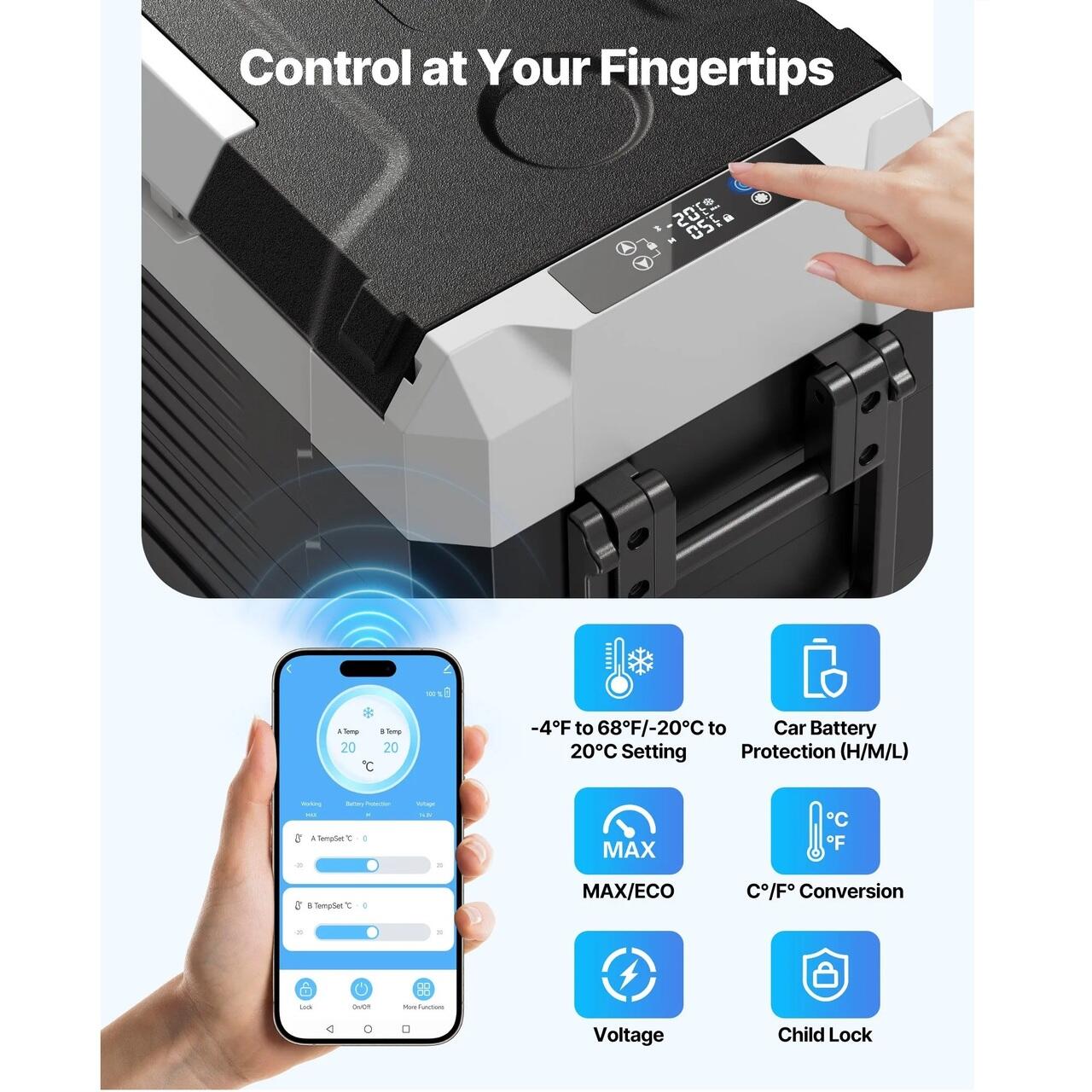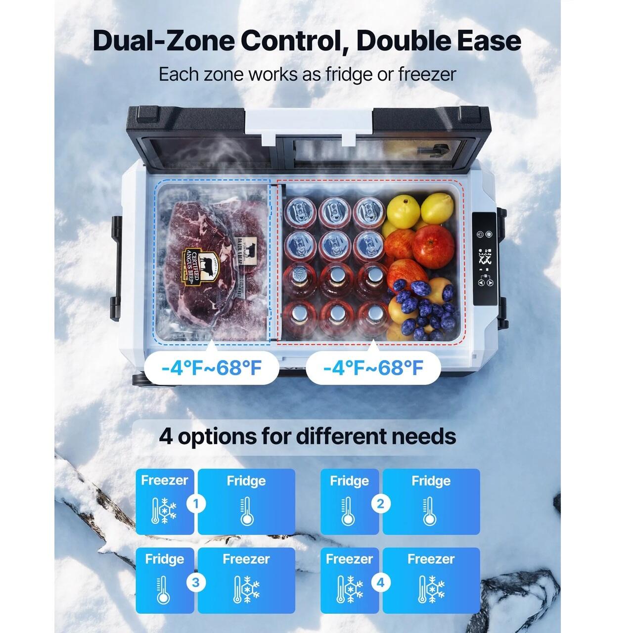 Control cu doua zone: Congelatorul auto ofera doua zone independente care racesc bauturile si congeleaza simultan produsele esentiale. Fiecare zona se ajusteaza de la -20°C la 20°C, permitand manipularea eficienta a diferitelor alimente in timpul calatoriilor, campingului, excursiilor de weekend sau planurilor in aer liber.