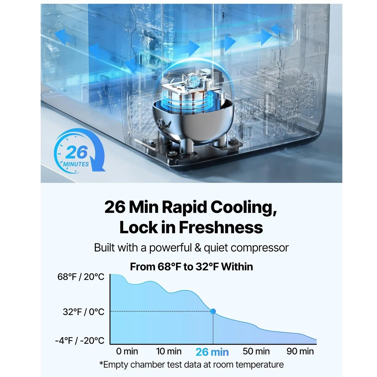 Putere de racire rapida: Racirea rapida permite frigiderului de camping sa atinga o temperatura de la 20°C la 0°C in aproximativ 26 de minute, cu un zgomot ≤45dB pentru o utilizare calma. Modul Max ofera racire rapida, in timp ce modul Eco reduce consumul de energie pentru a mentine consumul zilnic in limita a 1 kWh.