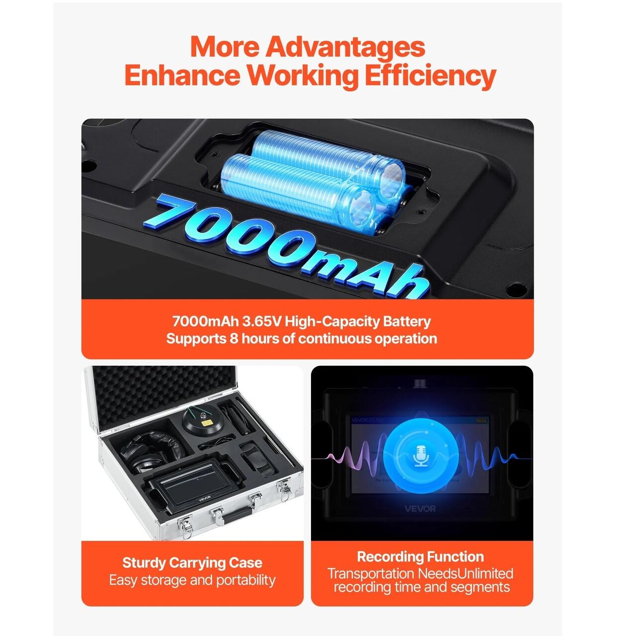 Autonomie mai mare: Alimentat de o baterie de mare capacitate de 7000 mAh 3,65 V, localizatorul de scurgeri de apa din instalatii sanitare suporta pana la 8 ore de utilizare continua. De asemenea, este livrat cu un card SD de 8 GB pentru stocarea datelor si o husa de transport durabila pentru transport convenabil.
