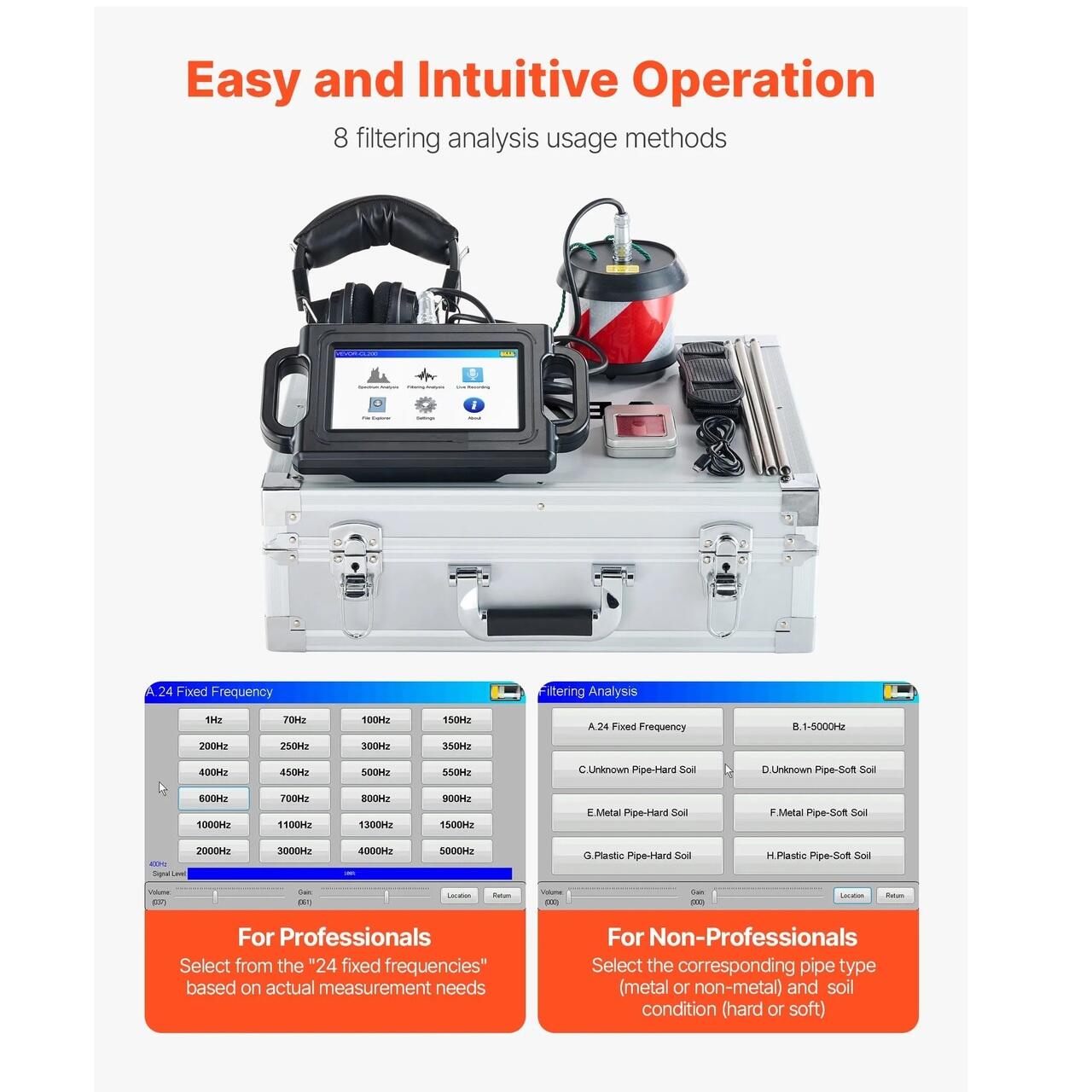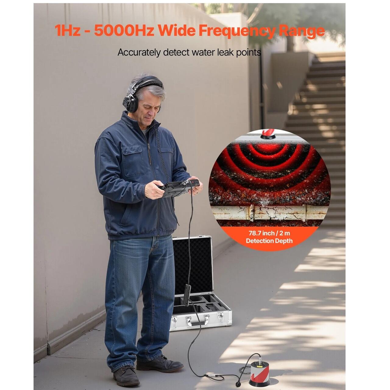 Detectarea precisa a scurgerilor de apa din conducte: Echipat cu un senzor sensibil, 3 tije de ascultare si casti cu anulare a zgomotului, acest detector de scurgeri de apa din conducte capteaza eficient semnalele sonore de scurgere. Se adapteaza flexibil la tevi metalice sau nemetalice, la sol dur sau moale, asigurand o detectare precisa a scurgerilor.