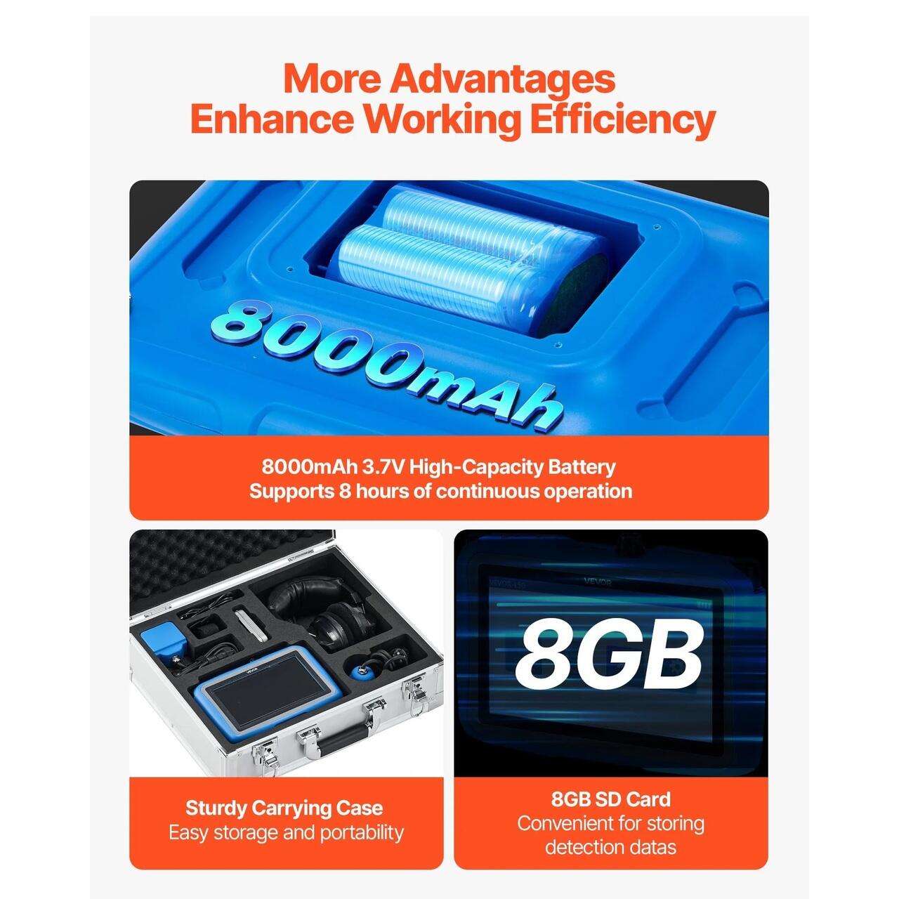 Autonomie mai mare: Alimentat de o baterie de mare capacitate de 8000 mAh si 3,7 V, acest localizator de scurgeri de apa pentru instalatii sanitare de interior permite o utilizare continua de pana la 8 ore. De asemenea, este dotat cu un card SD de 8 GB pentru stocarea datelor si o geanta de transport robusta pentru transport convenabil.